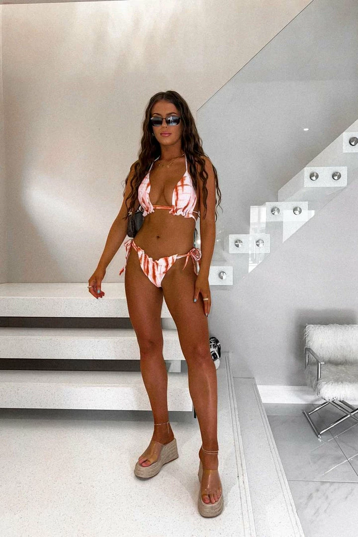 This set features a rust and white tie dye bikini top with ruffle detailing, tie side bottoms and a matching sarong.