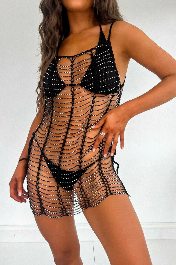 This cover-up dress features a black fabric, beaded detailing and a sleeveless design.
