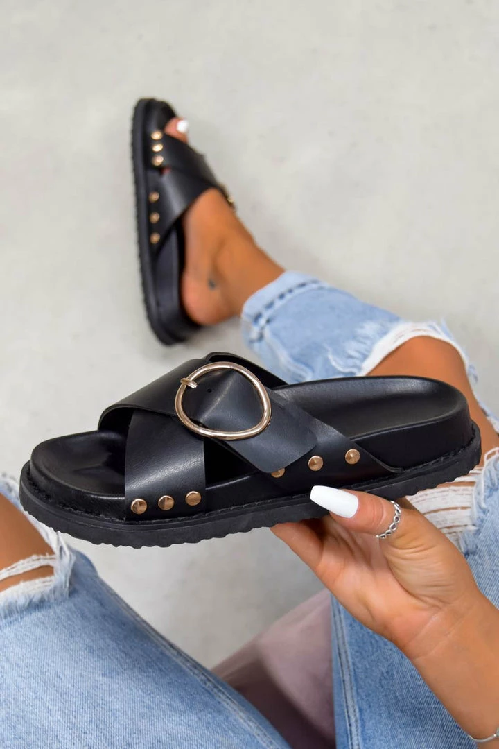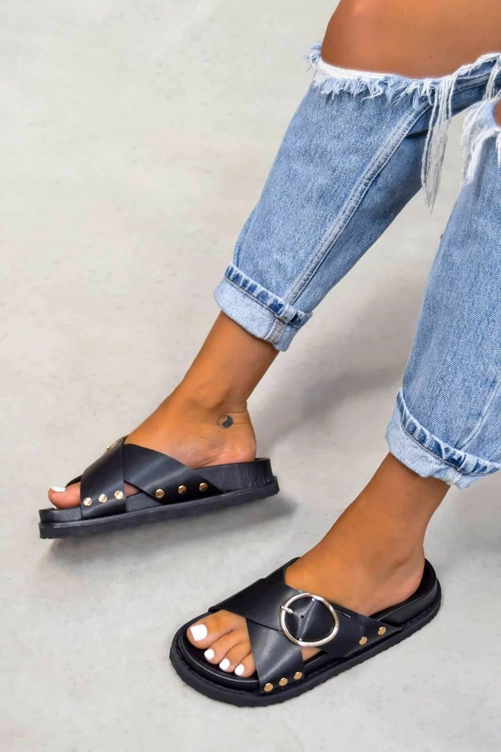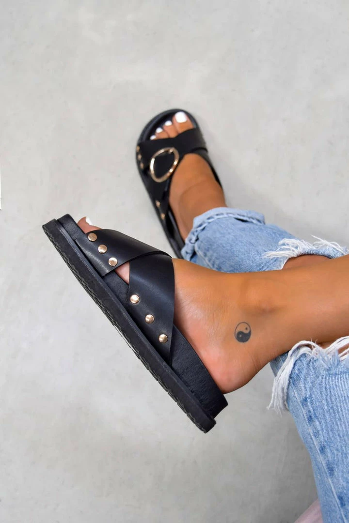 A definite Summer essential for this season, our San An slip on sandals will be your go to pair. Featuring a crossover strap design, studded trim and gold ring detail, pair with some ripped blue jeans to complete this look.