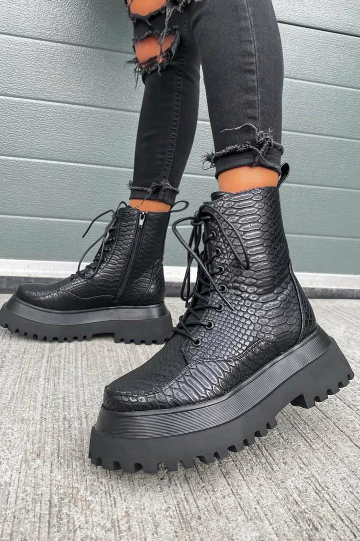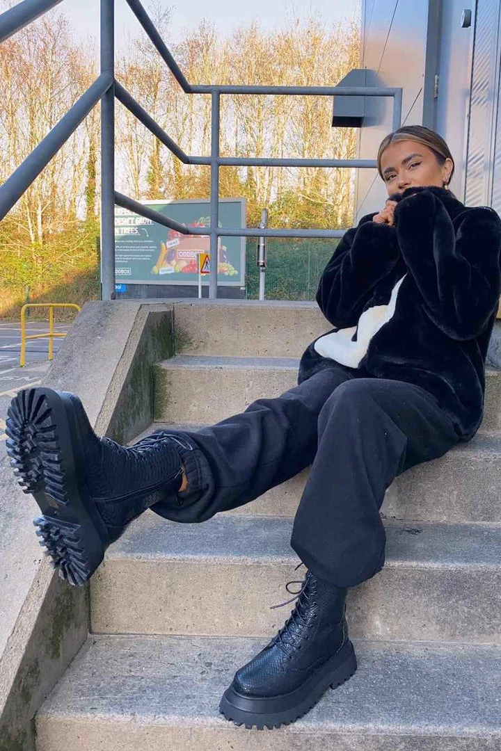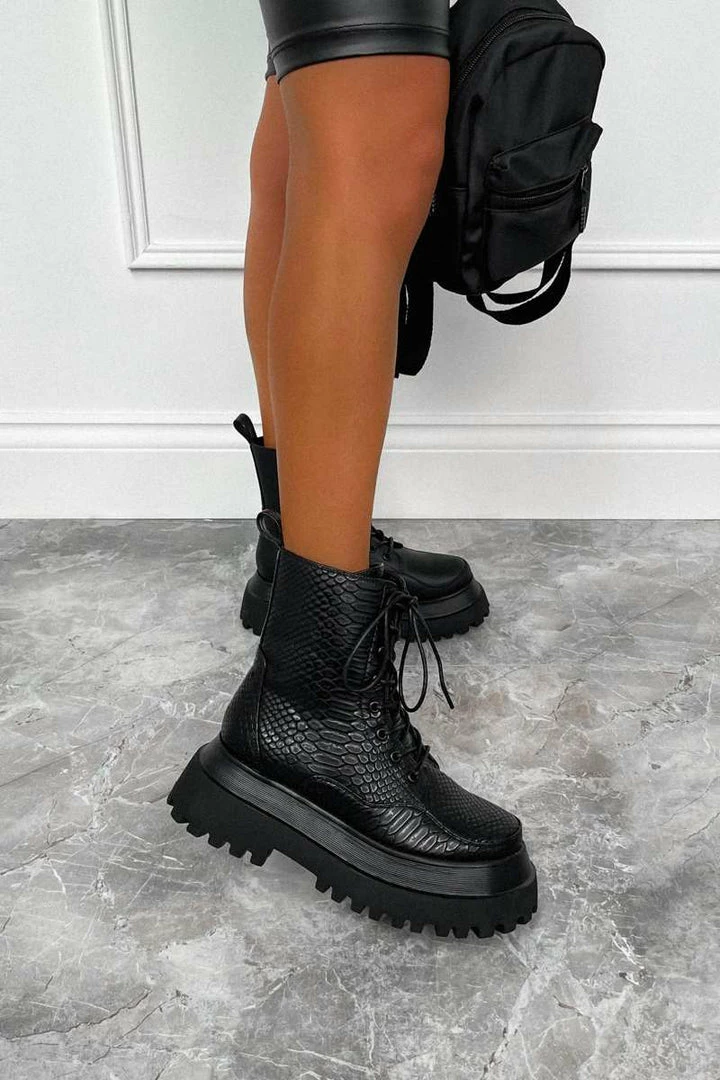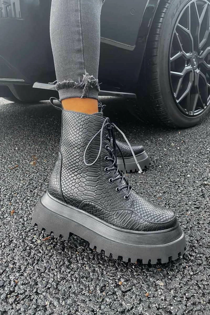 Take your boot game to the next level in the Raptor boots. Our most premium boot, created using the highest quality vegan leather and materials. Featuring a chunky platform sole, panelled upper detailing, croc print material and rear pull tab. The BADDEST boots you’ll own…. period!