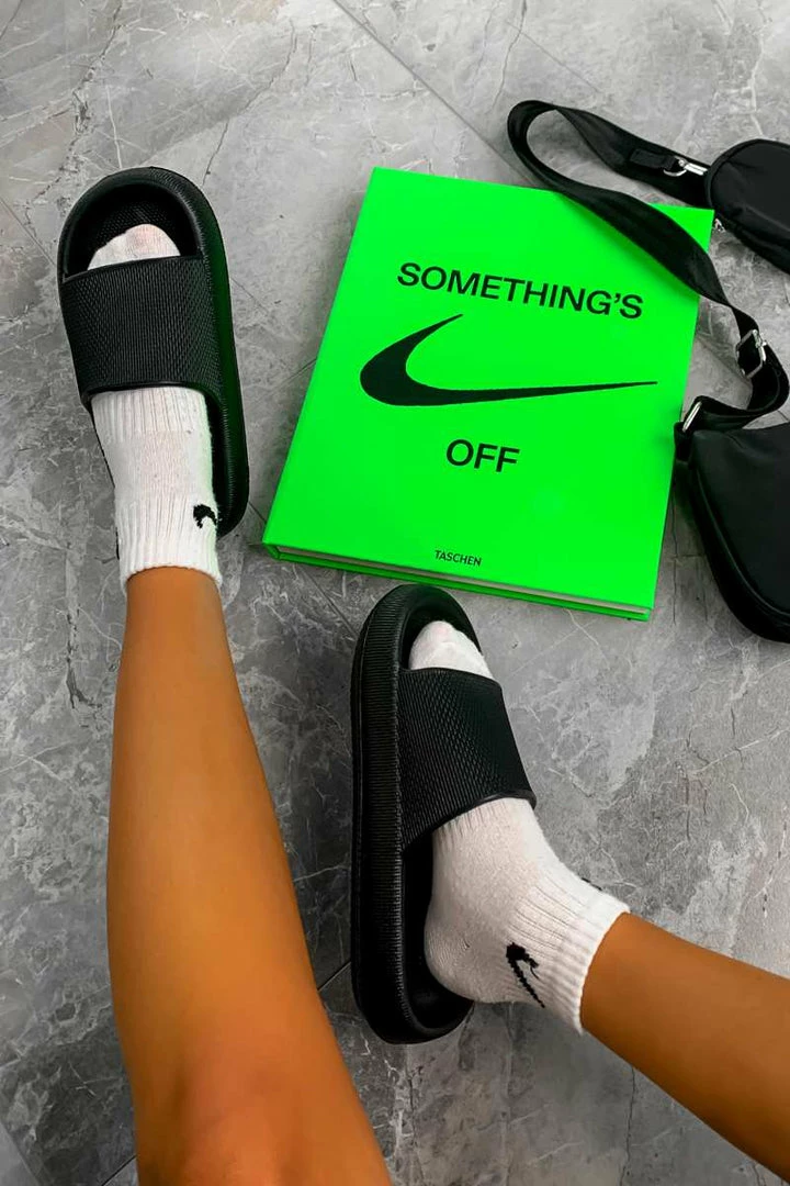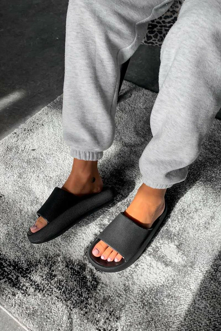 These new arrivals will be your go to this summer, featuring a black rubber textured material and a comfy flat design.