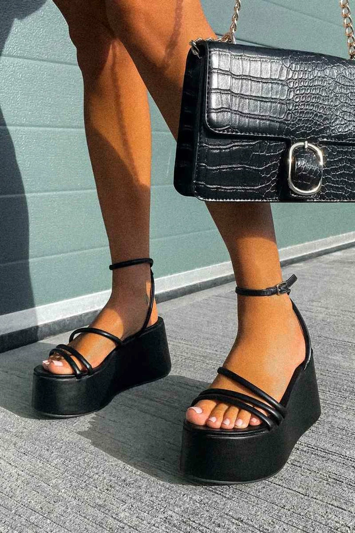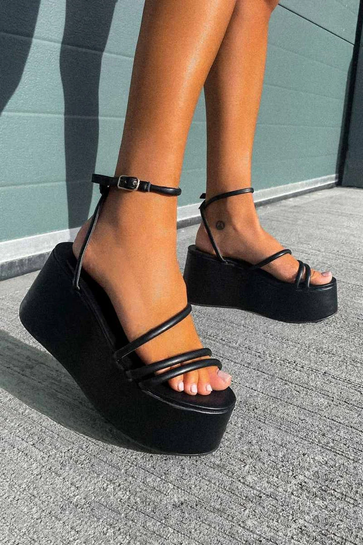 Summer season is upon us and we’ve got the perfect sandals to rock your day and night outfits! These beauts feature a super chunky platform design, with multiple buckle front straps and ankle buckle fastening. Pair with some black skinnies to complete this look.