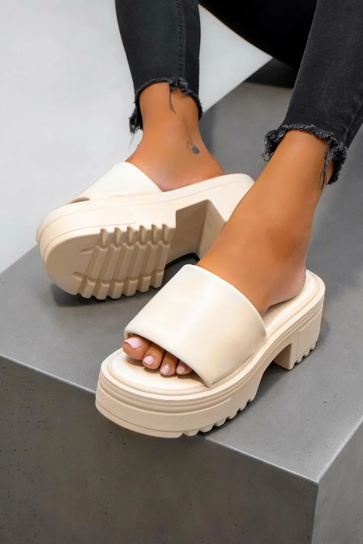 Our Lorella sandals feature a chunky platform sole, slip on design, with a thick front strap.