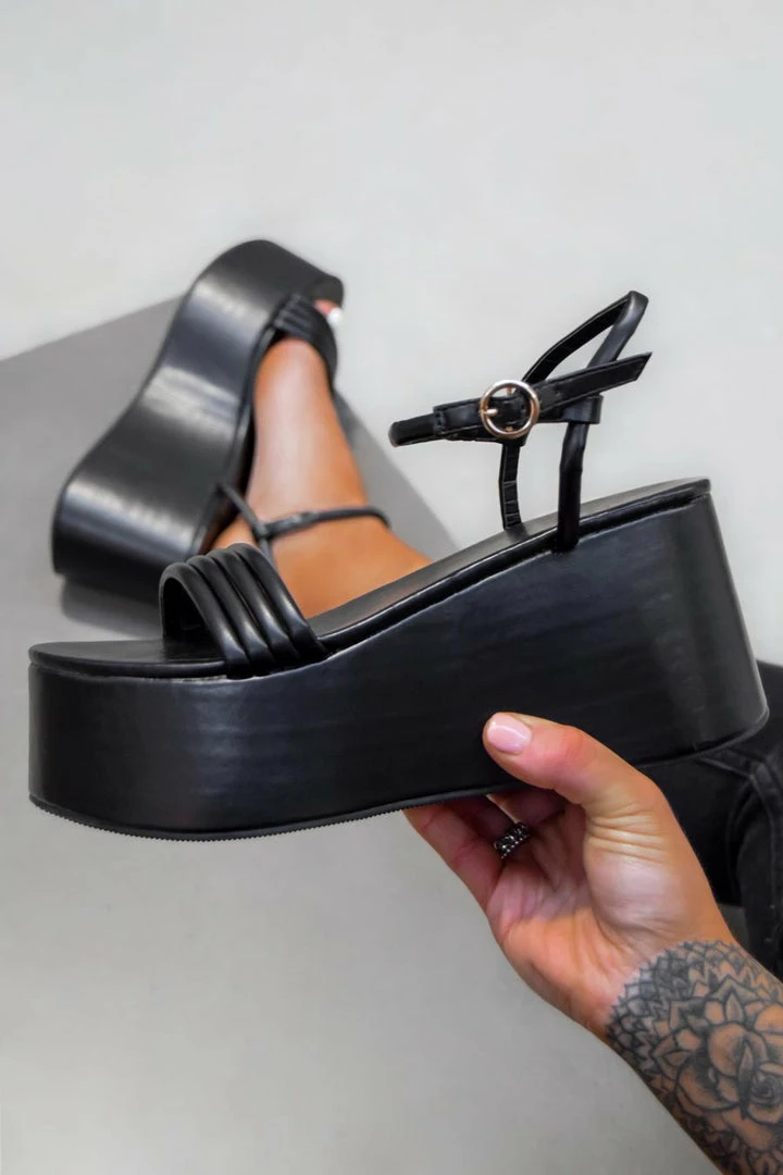 Our Macey sandals feature a chunky platform wedge sole, thick front and barely-there ankle strap with buckle fastening.