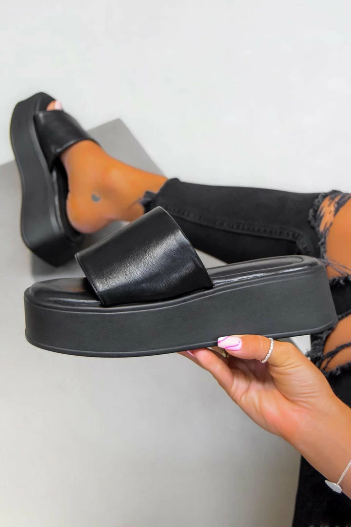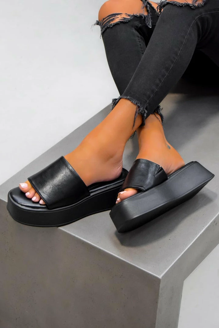 Our Rian sandals feature a chunky platform heel sole, slip on fit, with a thick front strap.