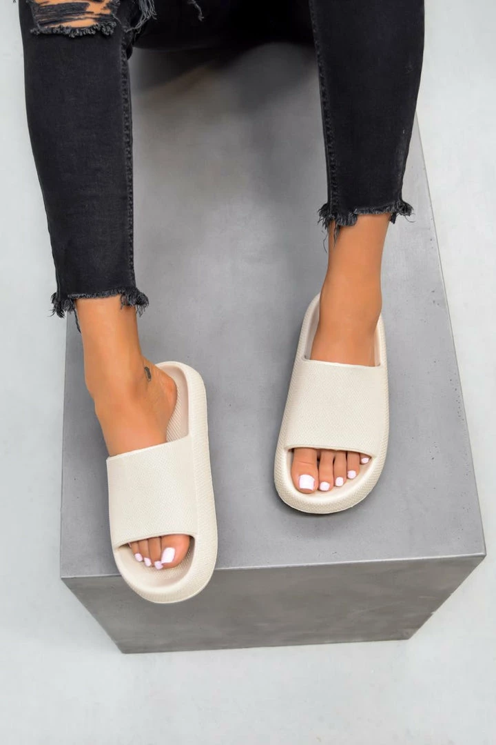 These new arrivals will be your go-to this summer, featuring a flatform design and textured material in beige sand.Â
