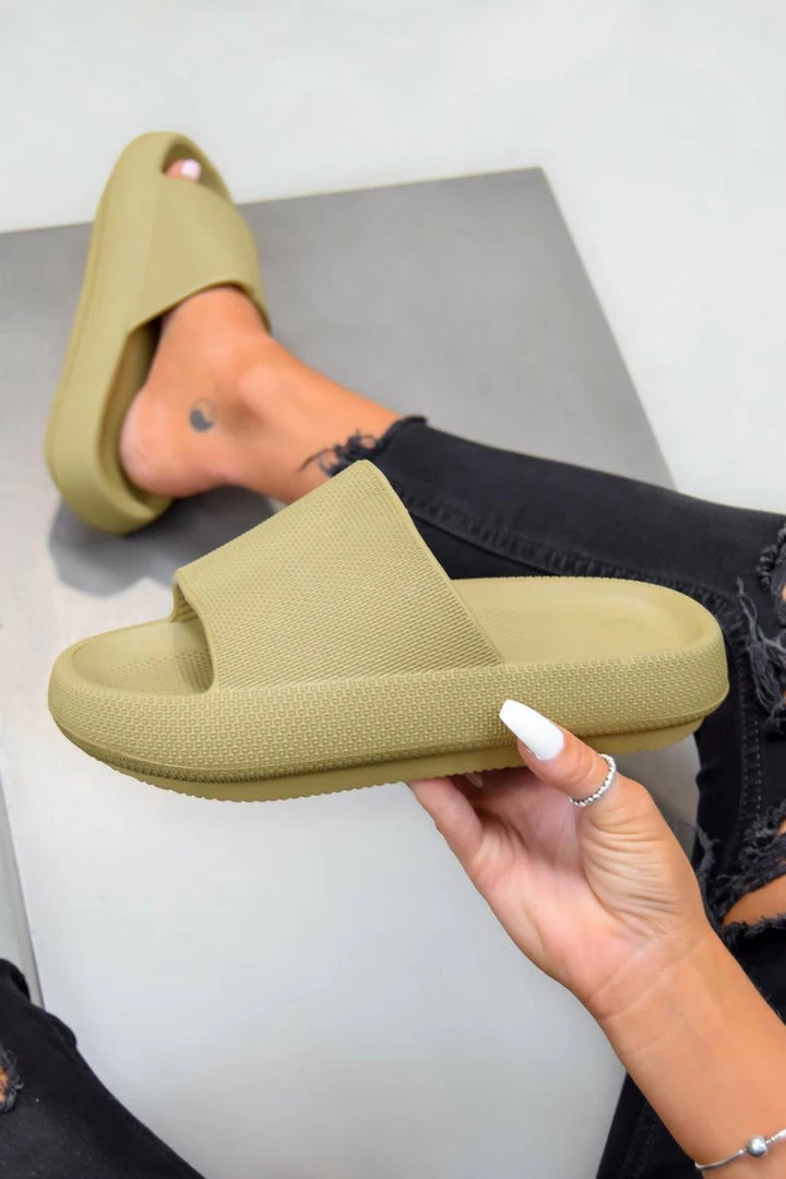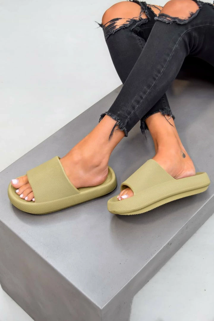 These new arrivals will be your go to this summer, featuring a Khaki rubber textured material and a comfy flat design.