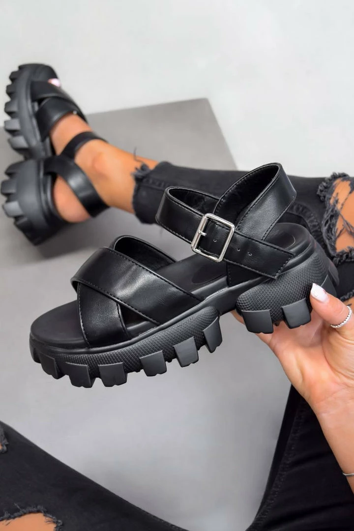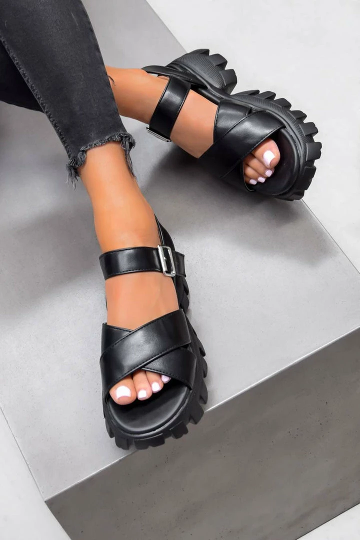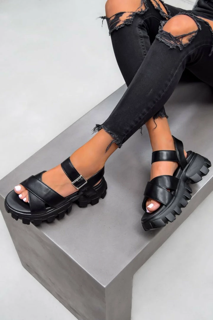 Get your Summer looks locked in with these chunky new arrivals, we’re obsessed! Featuring a chunky platform sole, crossover front straps and ankle buckle fastening. Pair with some black ripped jeans to complete this look.