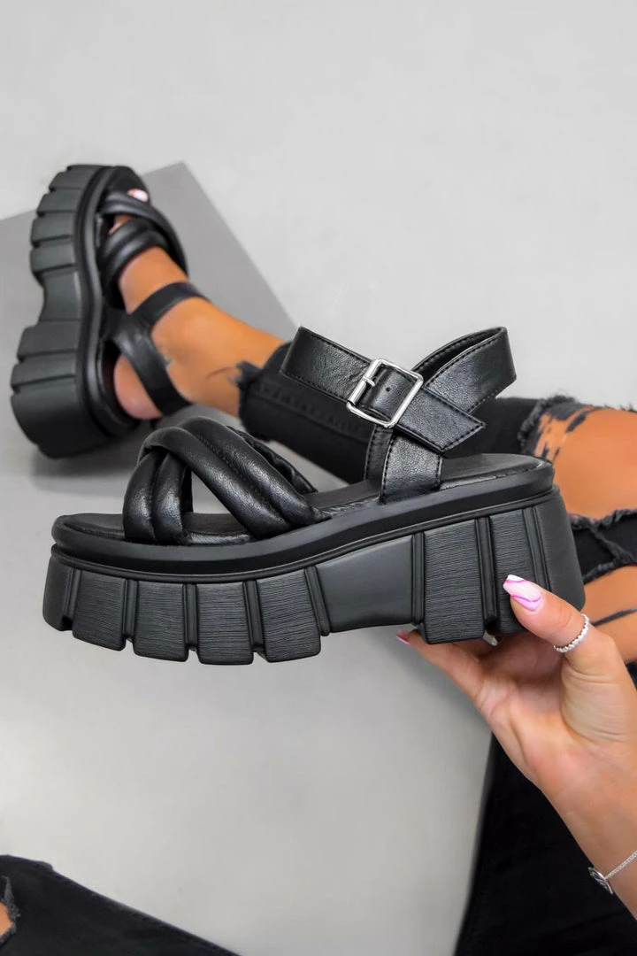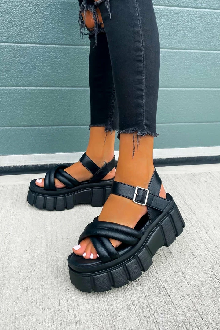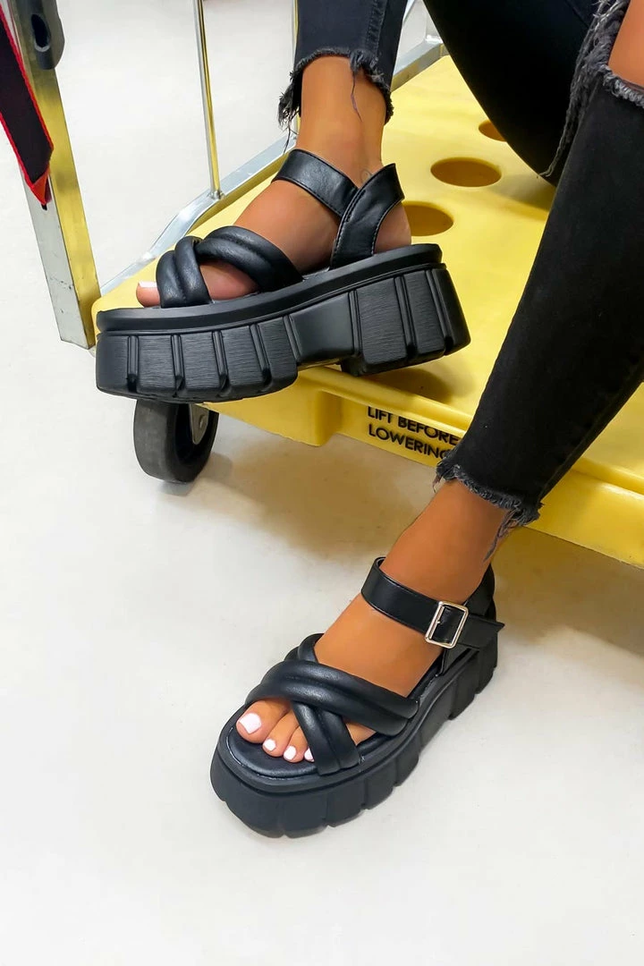 Our Control sandals featuring a super chunky platform sole, cross over quilted upper section and buckle ankle strap.