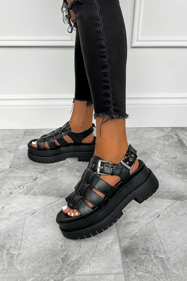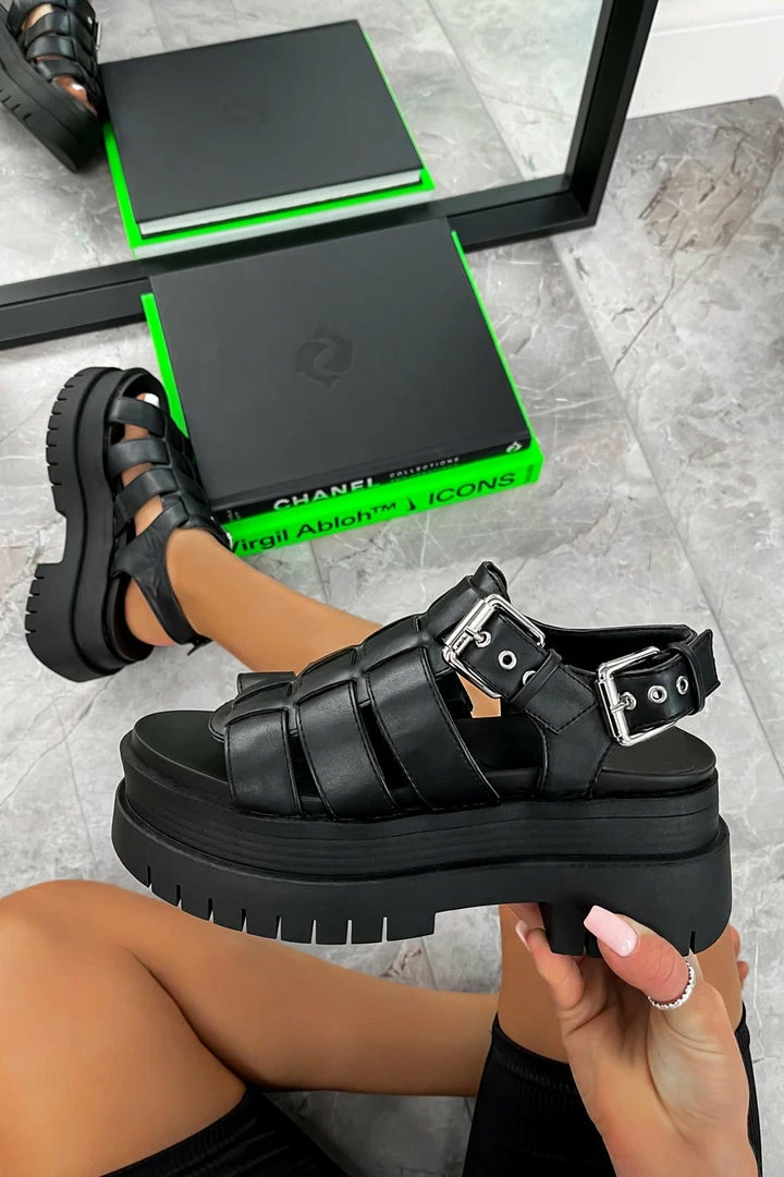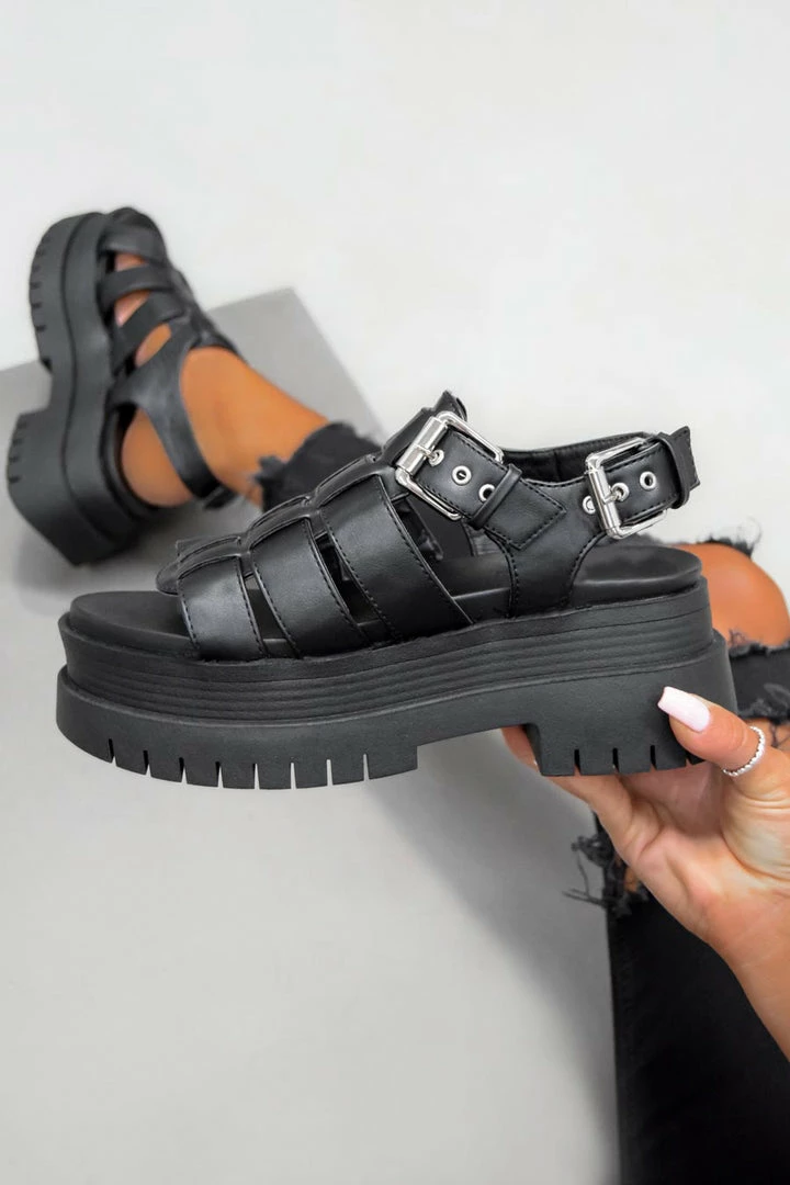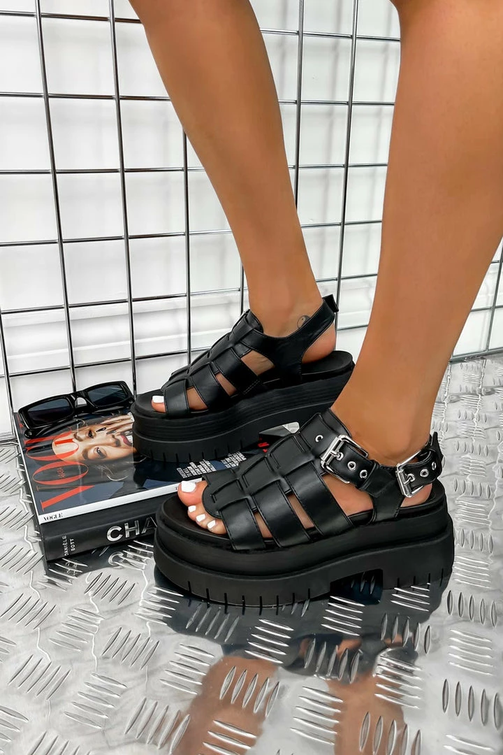 Our Damage sandals feature a super chunky platform sole, gladiator-style front straps and silver buckle details.