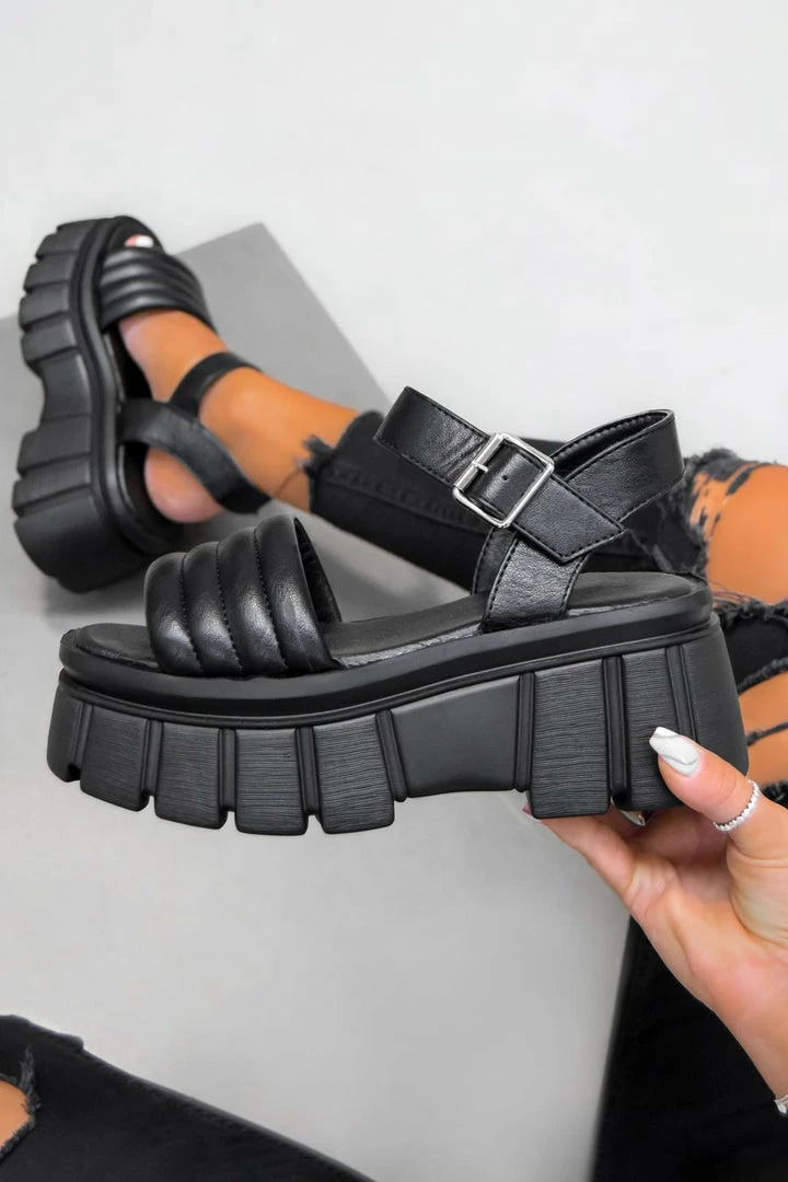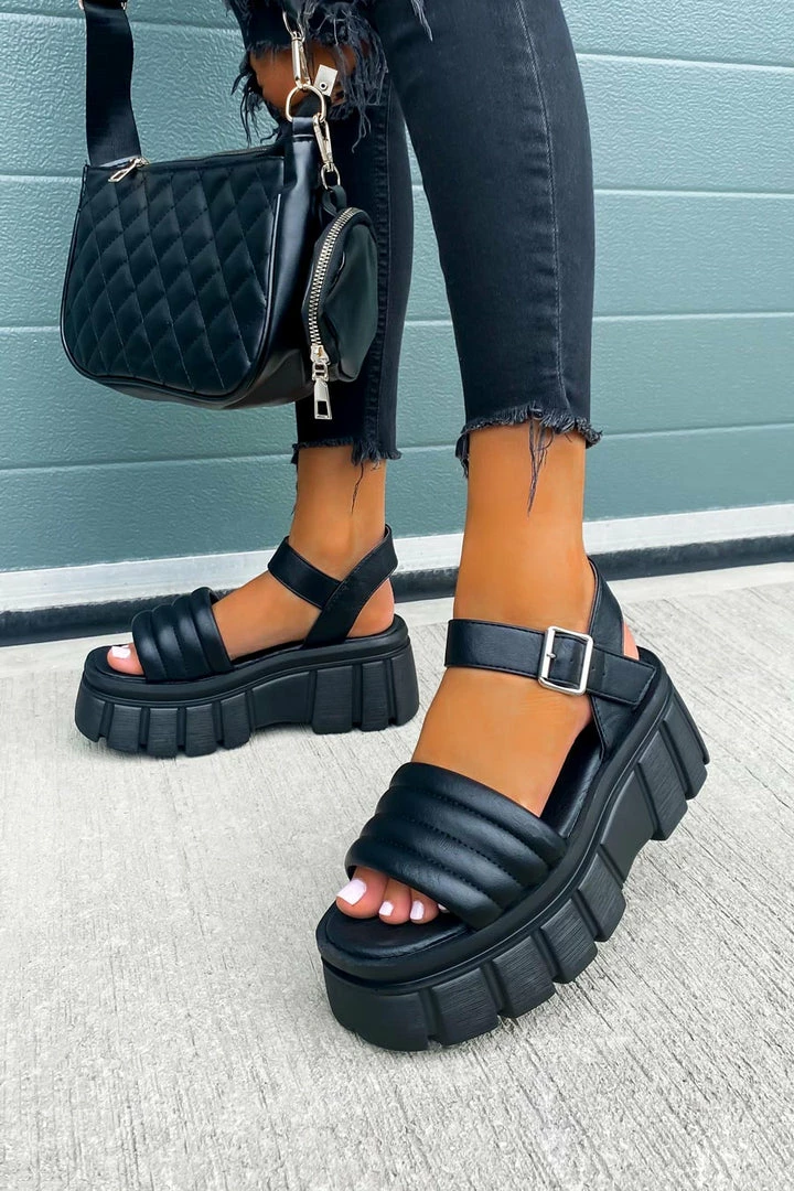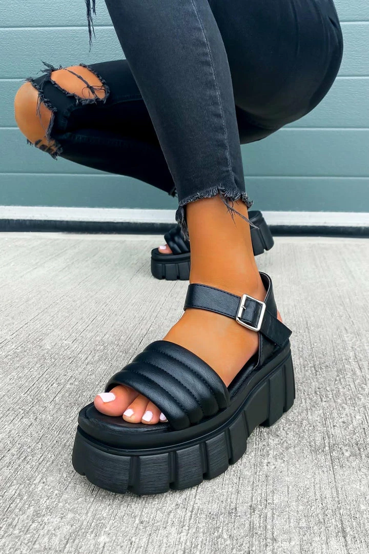 Our Deflekt sandals featuring a super chunky platform sole, quilted upper section and buckle ankle strap.