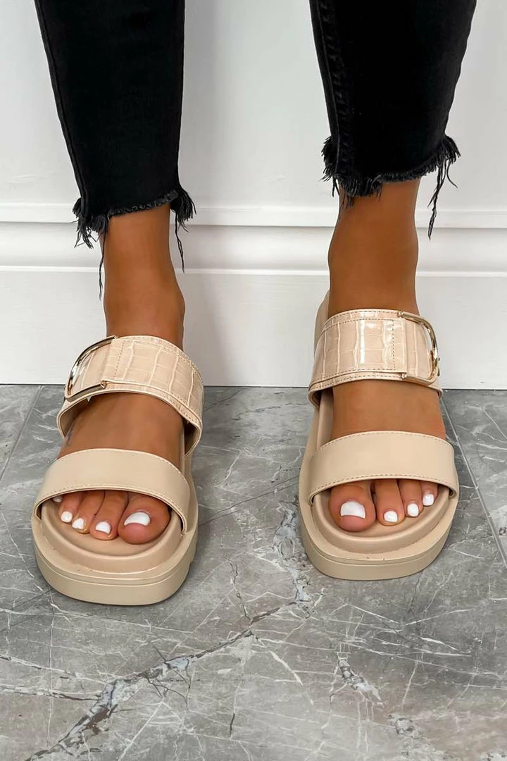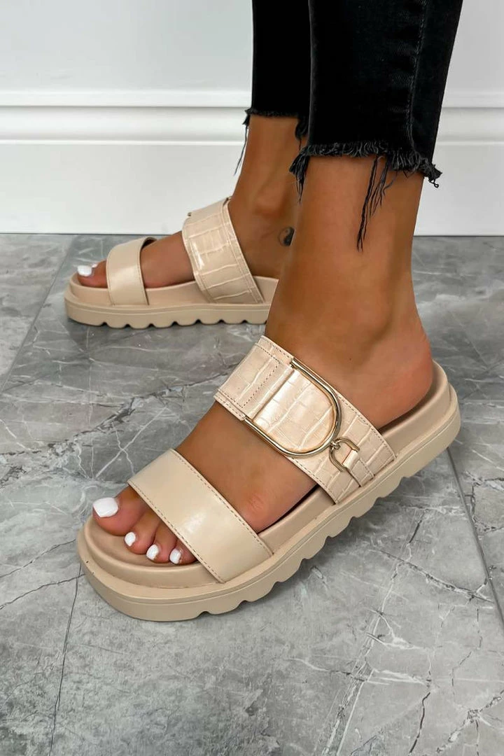 Our Step It sandals feature a chunky sole, 2 thick front straps with this seasons must have croc print and finished with gun metal details