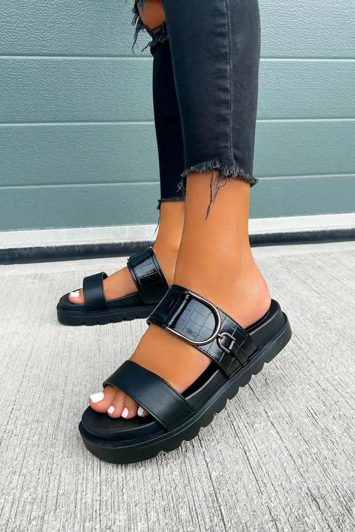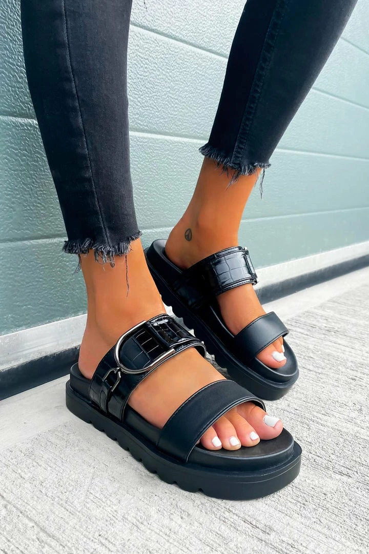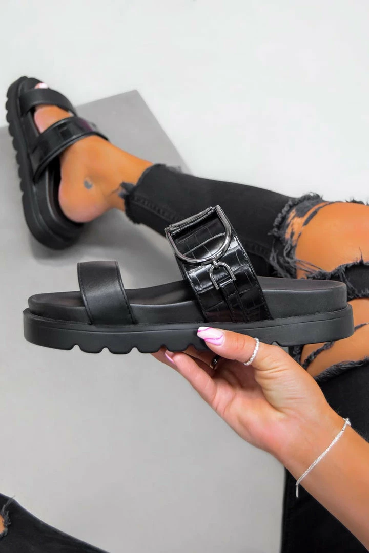 Our Step It sandals feature a chunky sole, 2 thick front straps with this seasons must have croc print and finished with gun metal details