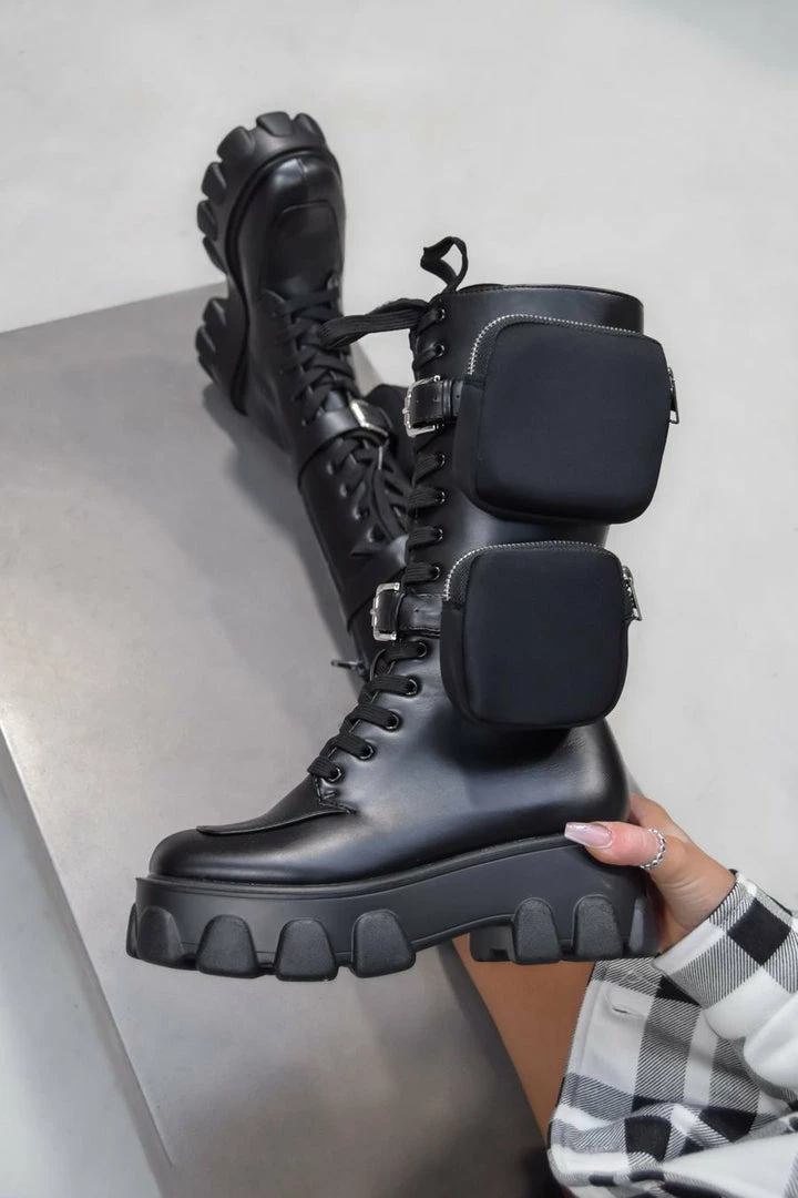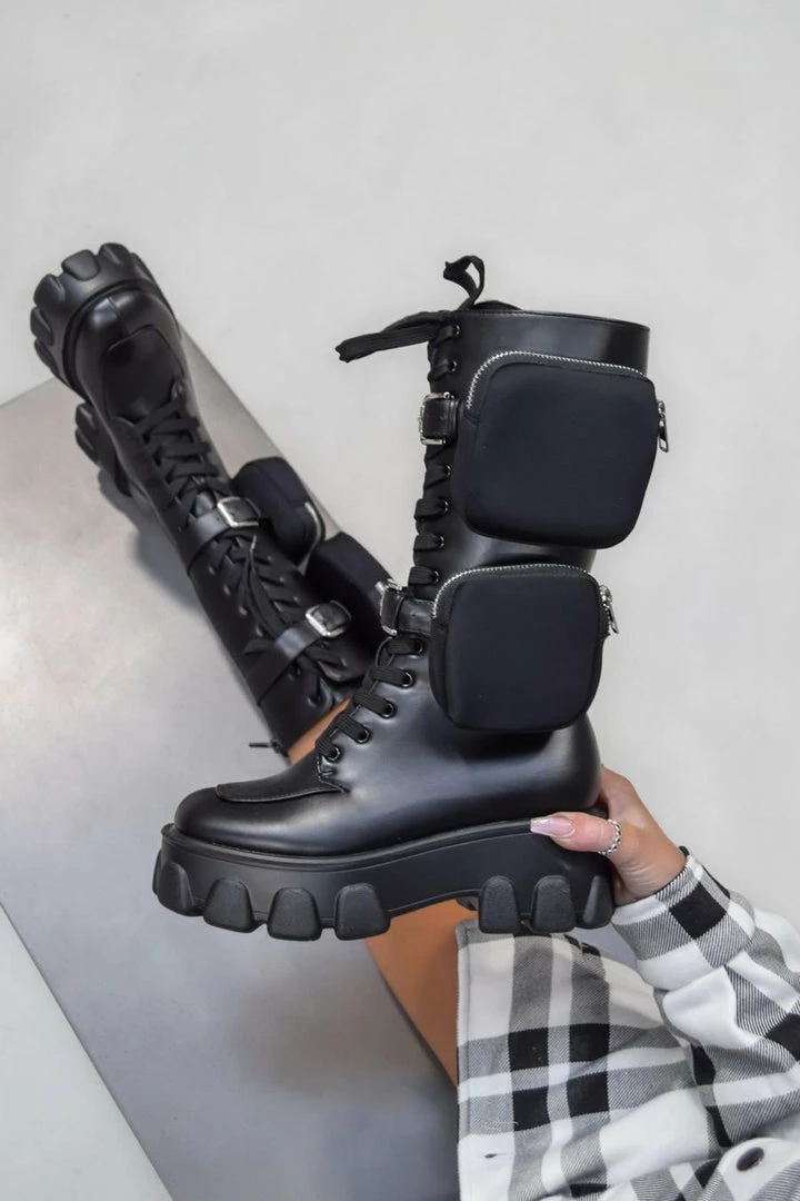 These new boots will be your favourite this winter! Featuring a lace up front, double side pocket detail, chunky sole and matte PU finish, they’ll add that extra edge to your look this season.Â