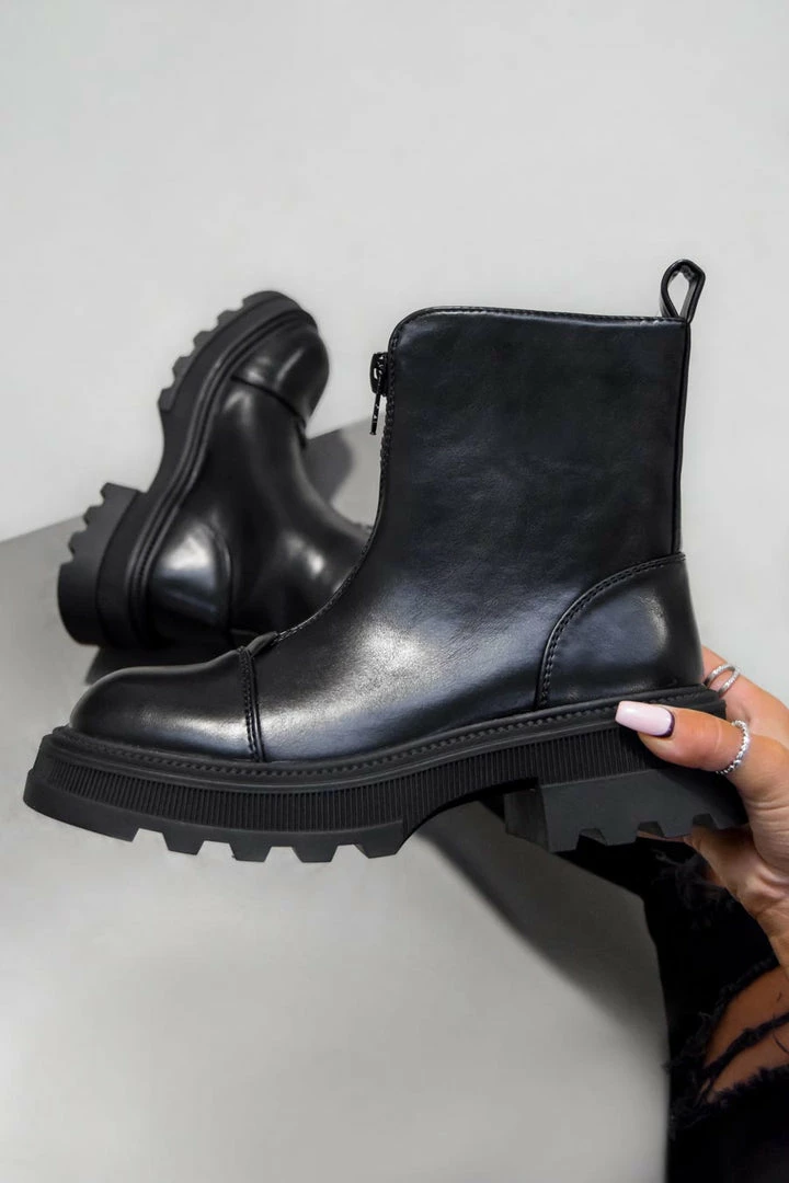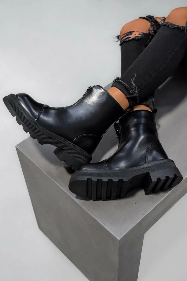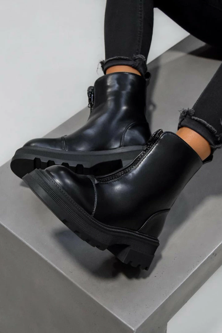 Our Delegate boots featuring a chunky platform sole, zip front detail and black PU finish.Â