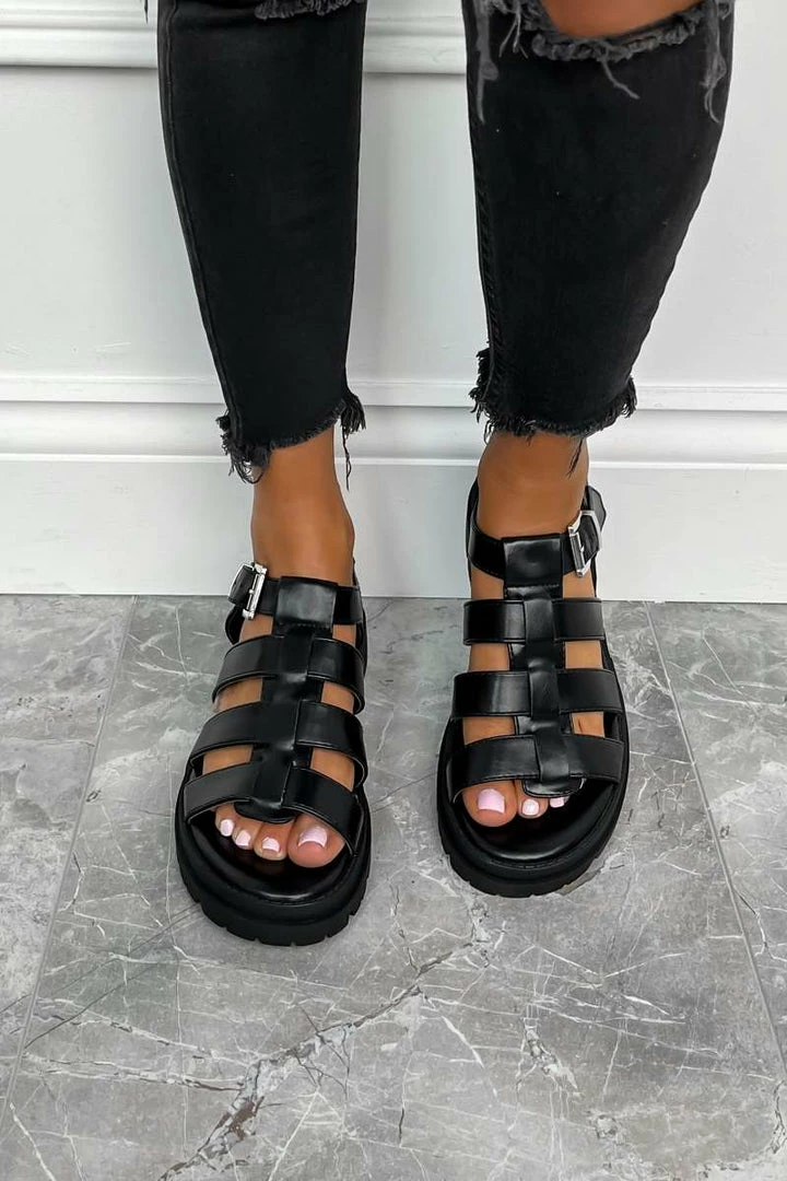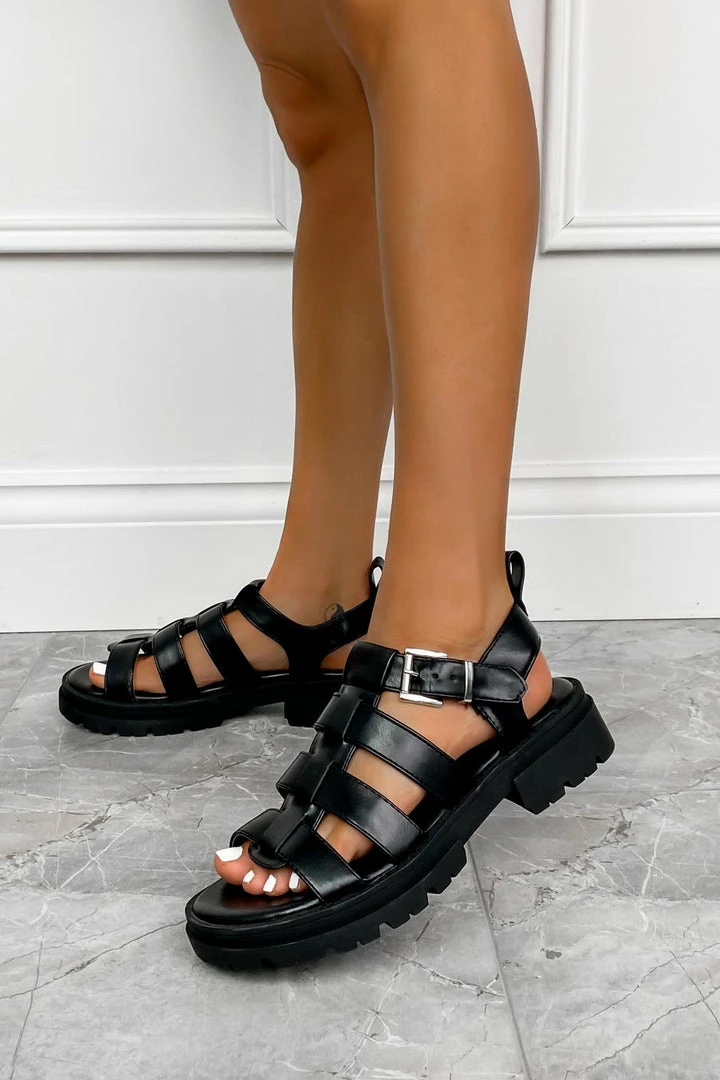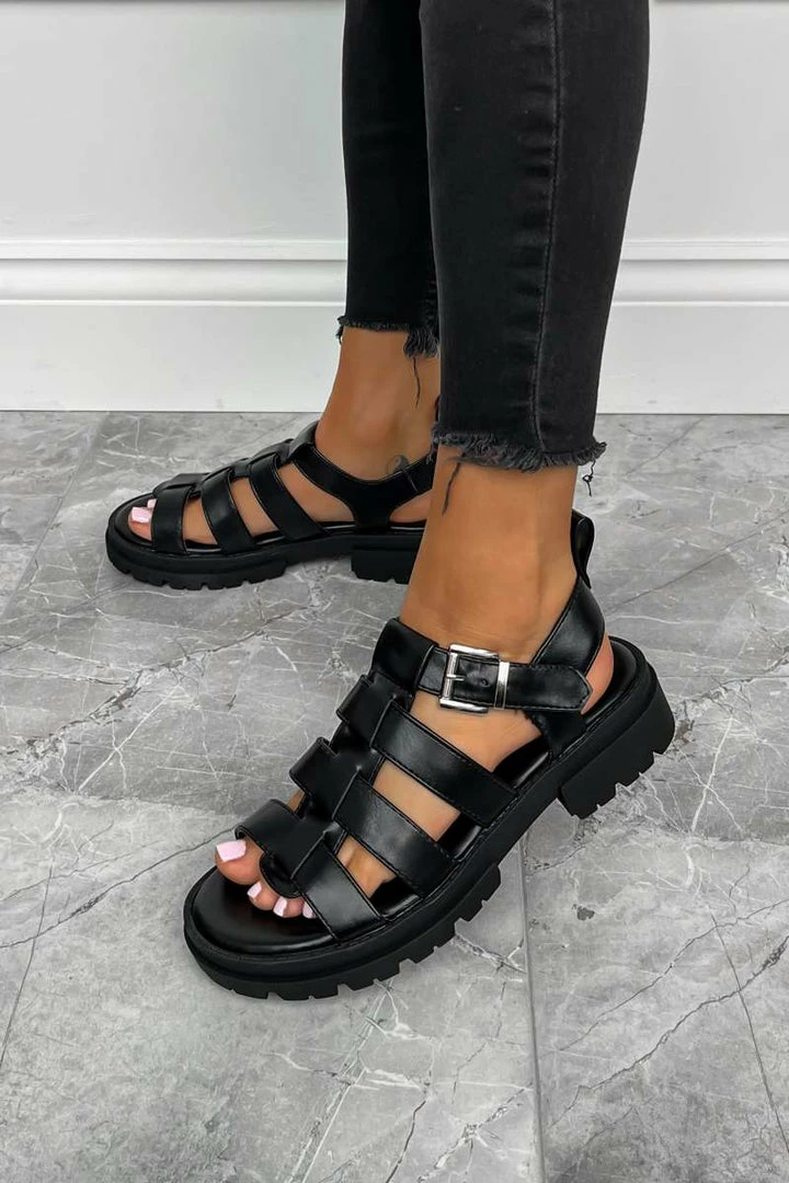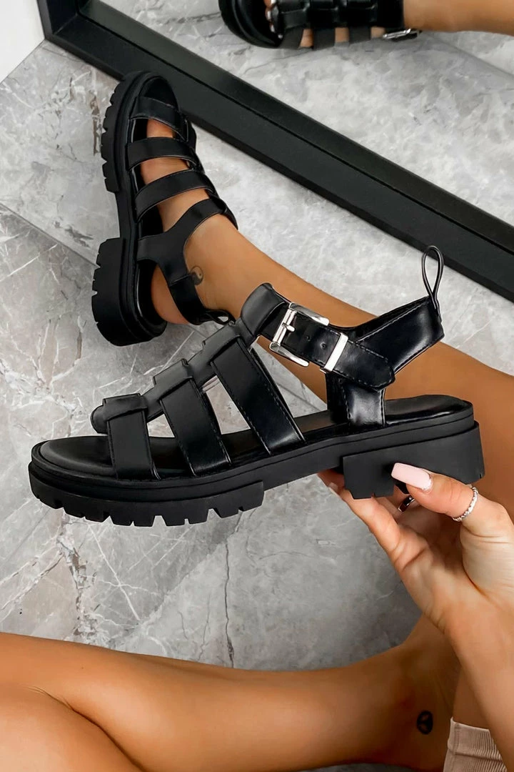 Our Hallie sandals feature a multiple strapped front, silver buckle fastenings and chunky sole.