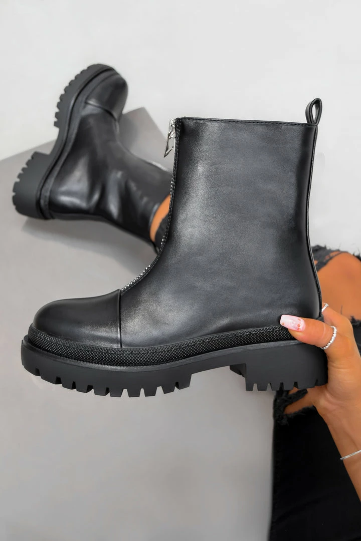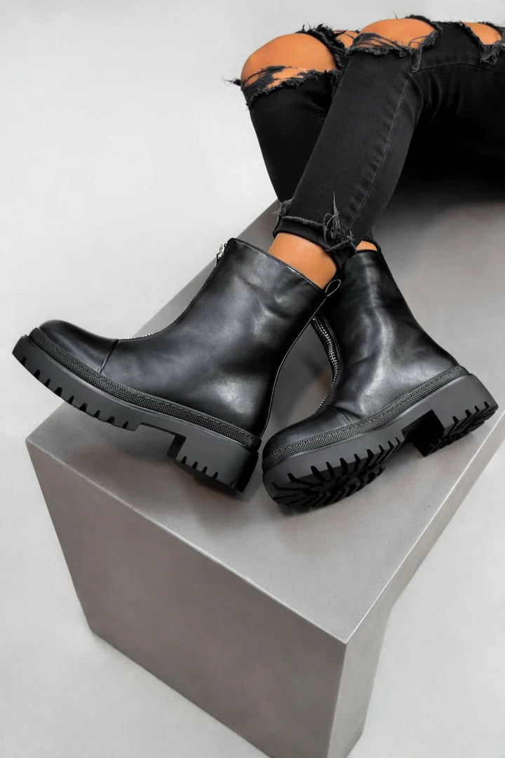 Our Joni boots feature a chunky platform sole, silver zip front detail and black PU finish.Â