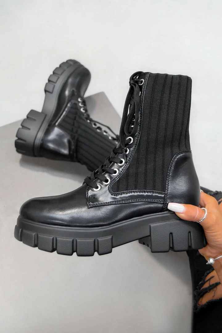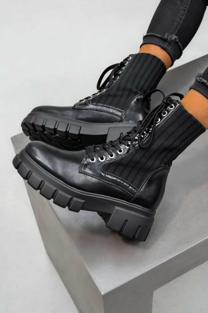 Our Lili boots feature a lace up front with silver eyelet detail, a sock fit design and chunky ridged sole.