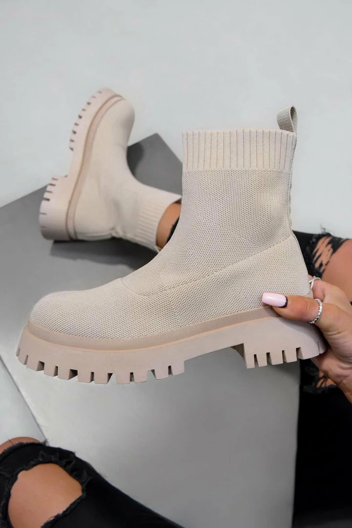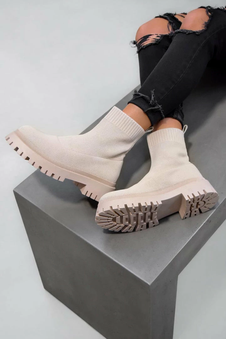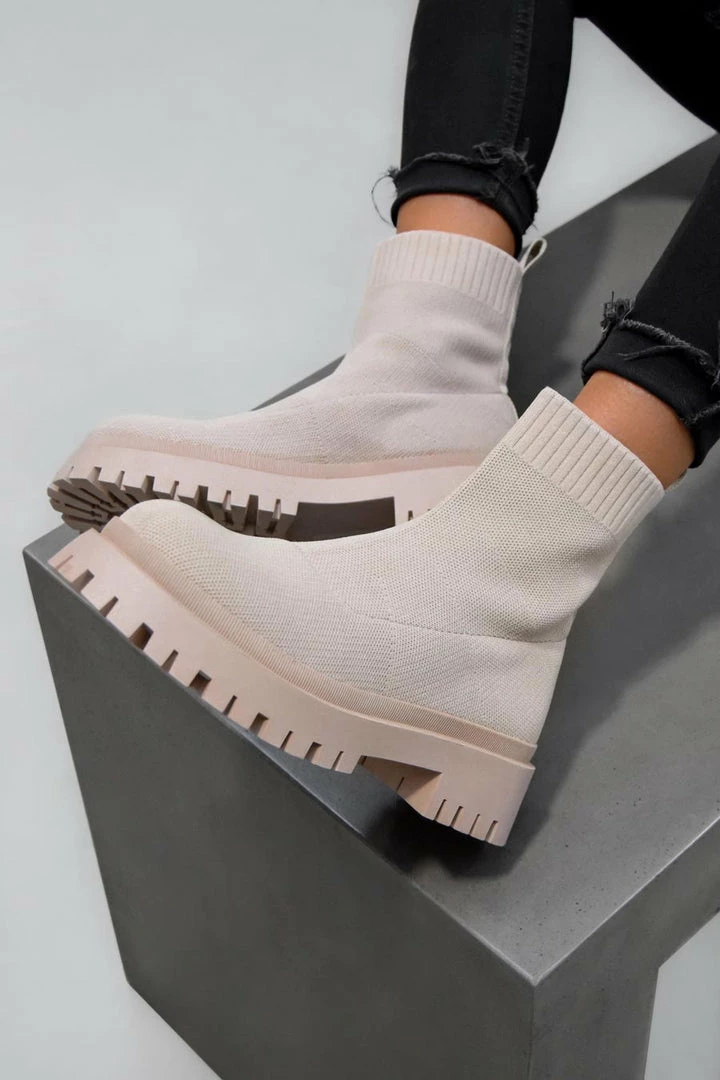 Our Maddie boots feature a sock-fit design with a chunky platform sole.