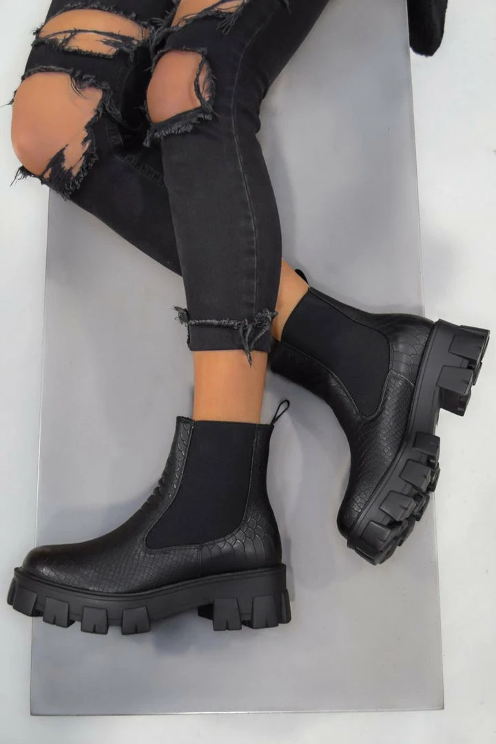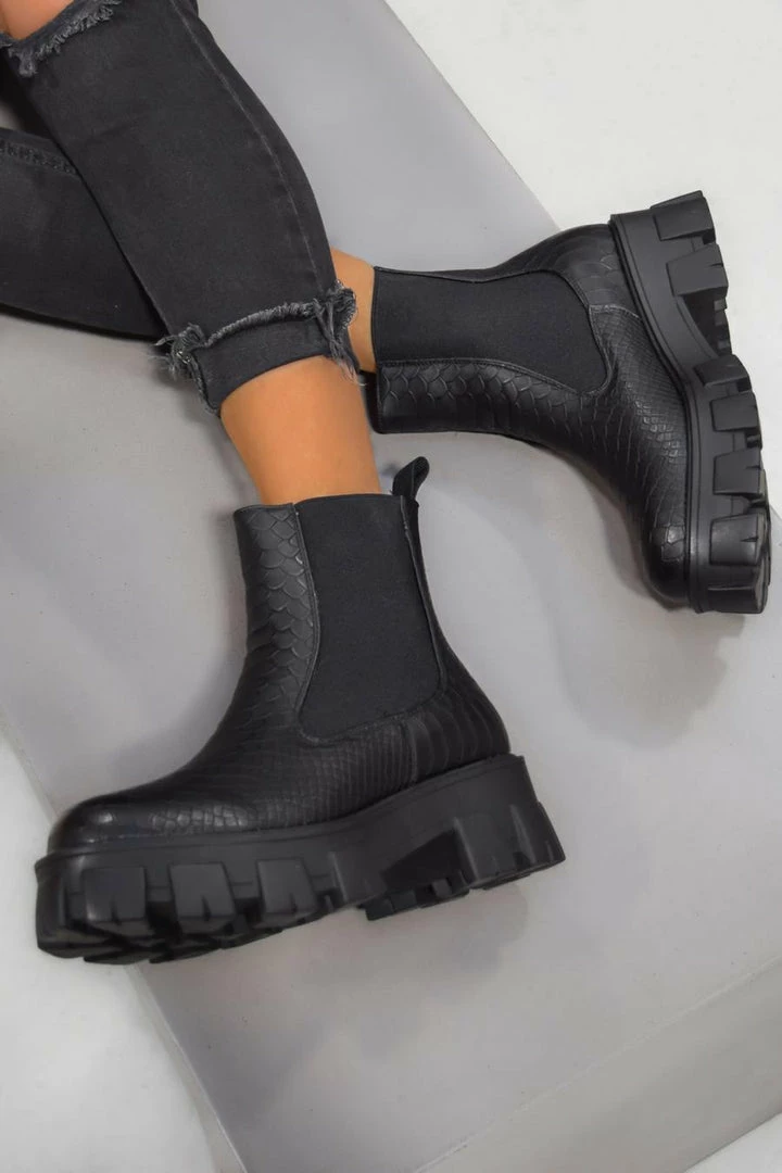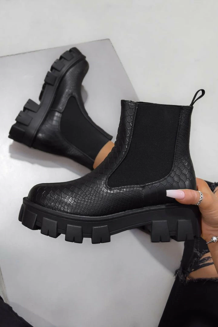 These new boots will be your Fav this season, featuring a chunky platform sole, chelsea design and croc print material. Pair with some black skinnies and your outfit will be goals.