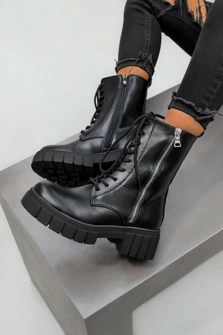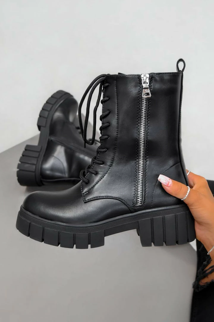 DMF REACT Lace Up Biker Ankle Boots – Black PU SHOES