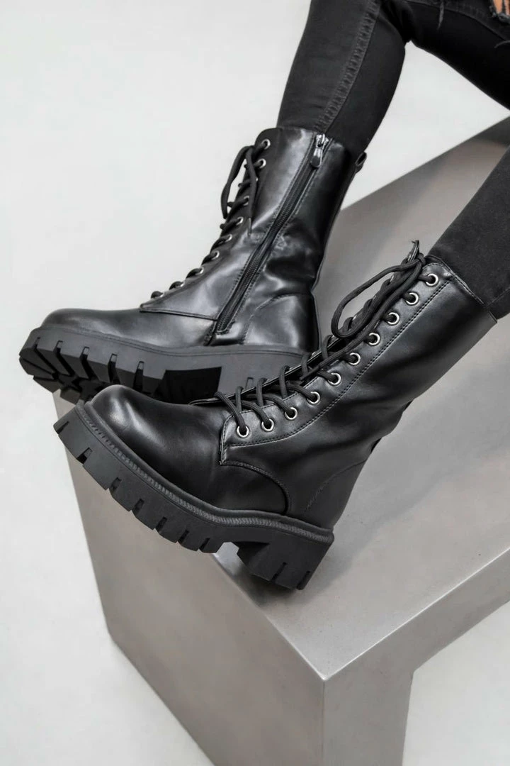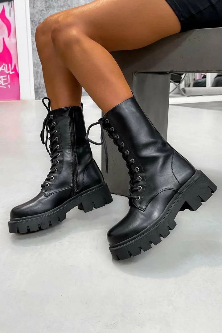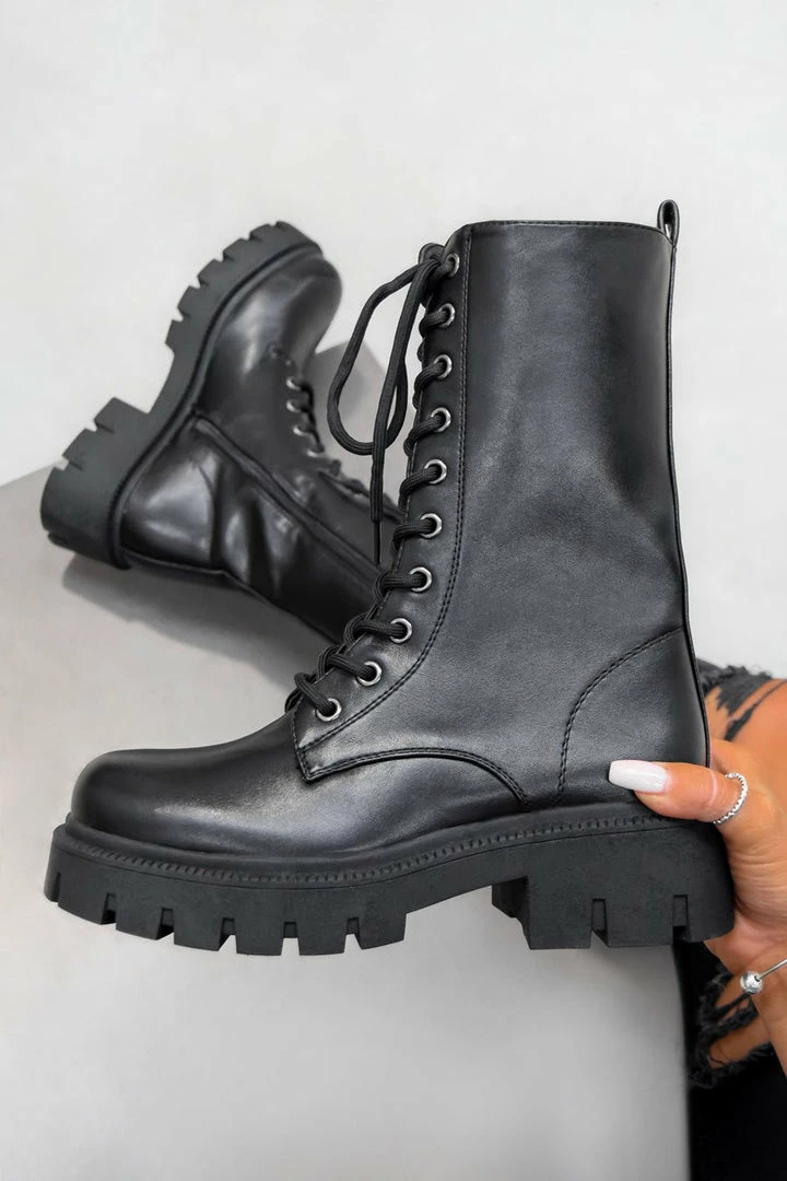 Our Brooklyn boots feature a chunky platform sole, lace up front with silver eyelets and are mid calf length.