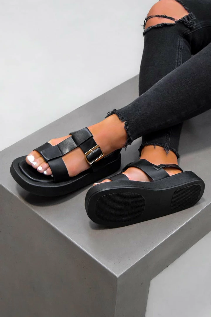 Our Leona sandals featuring a chunky sole, gladiator style front straps and a buckle fastening.Â