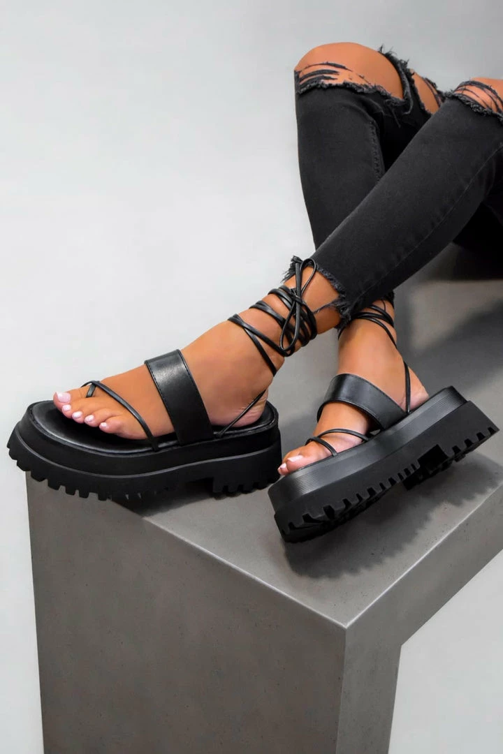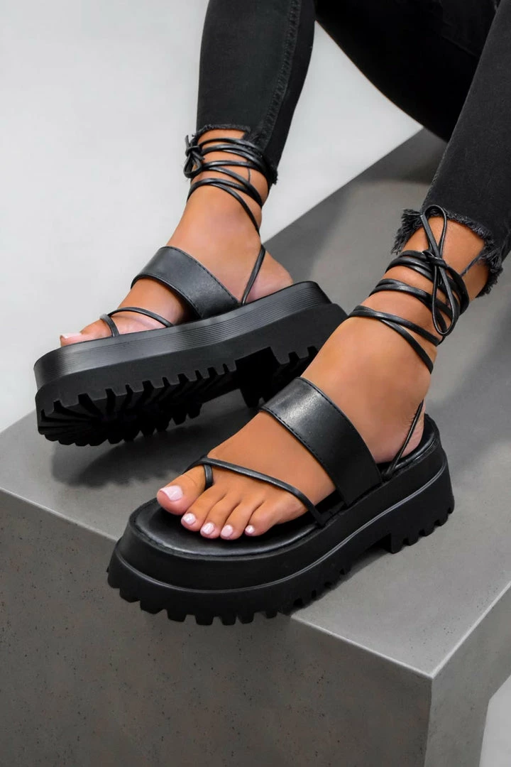 Our Shania sandals feature a super chunky platform design, toe post with lace up fastening. Â