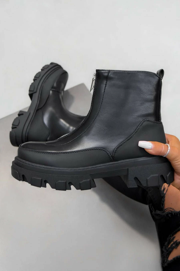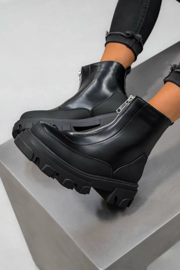 Our Tough Love boots features a chunky platform sole, silver zip front detail and panelling around the side.