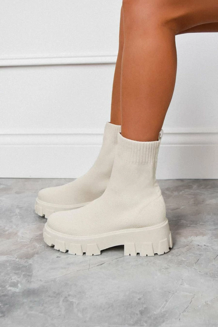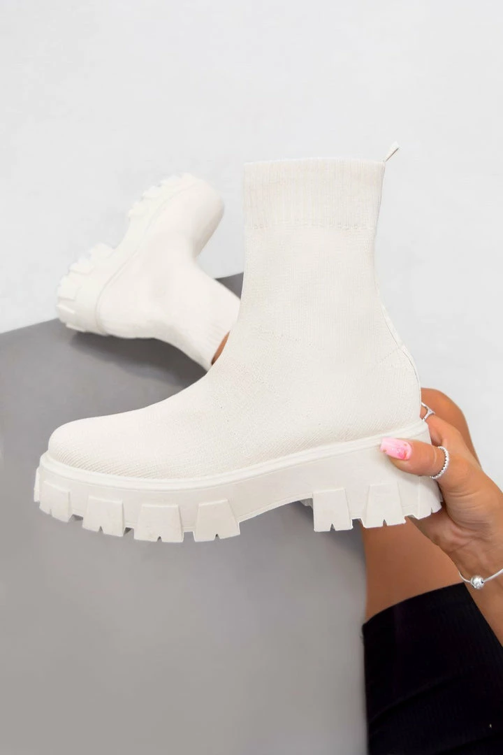 Boss it this season these new arrivals! Featuring a sock-fit upper, chunky platform sole and ribbed cream material.Â