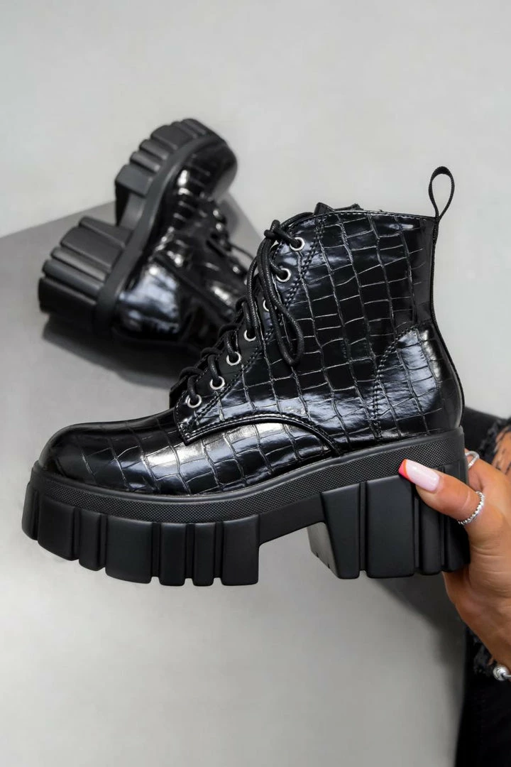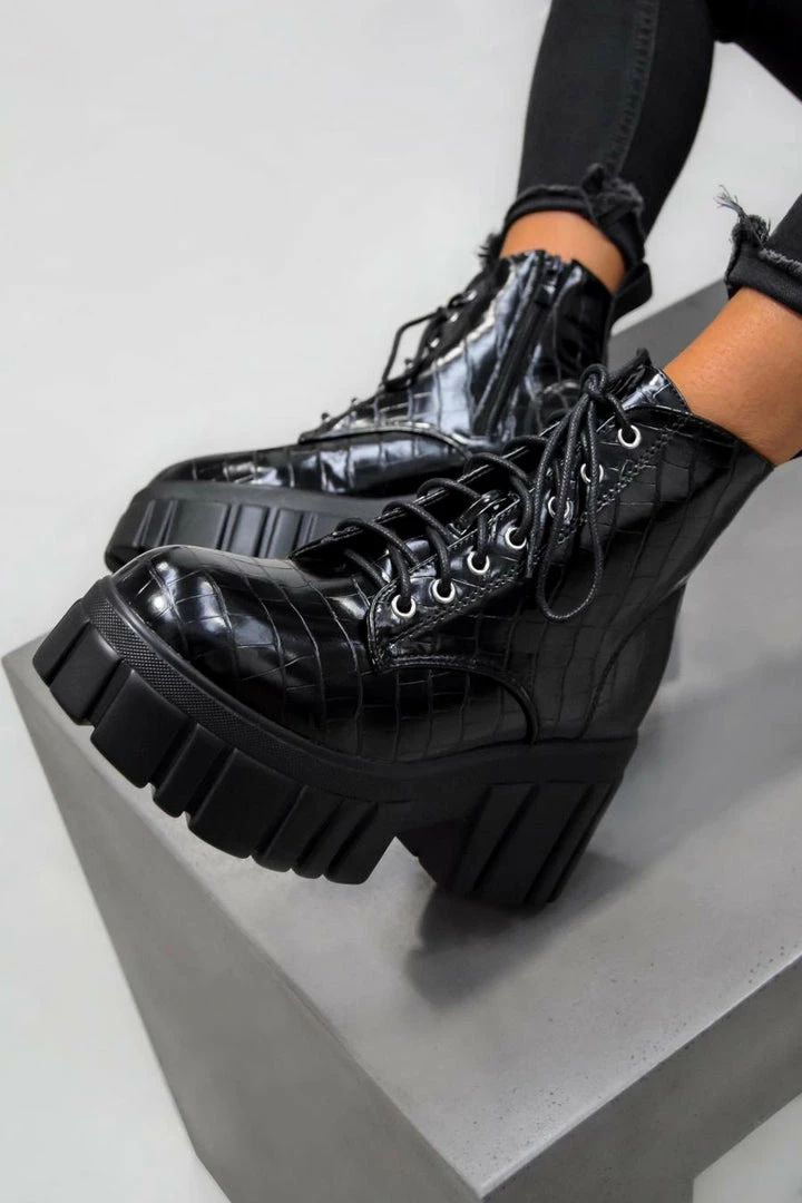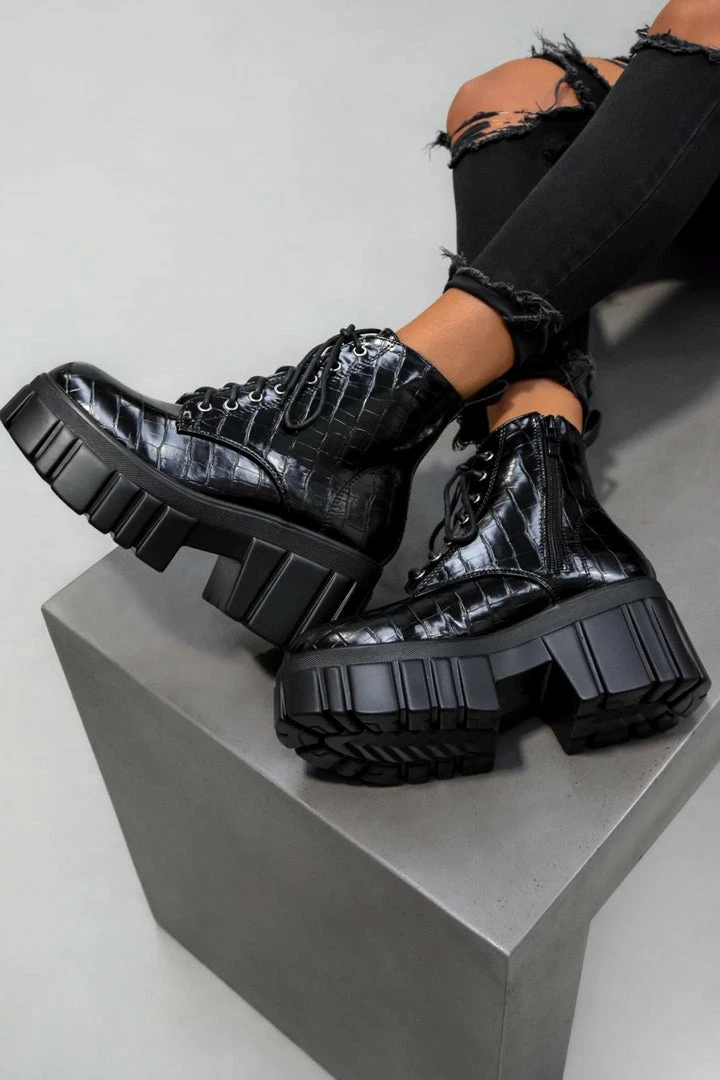 Our Kahlia boots feature a super chunky ridged platform sole, lace up front with a croc PU finish.Â