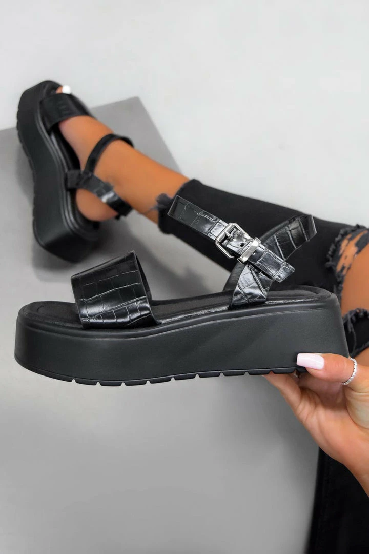 Our Krystal sandalsĀ featureĀ a chunky sole with a padded cushion for extra comfort,Ā a croc pu material strap over the toe and an ankle buckle fastening