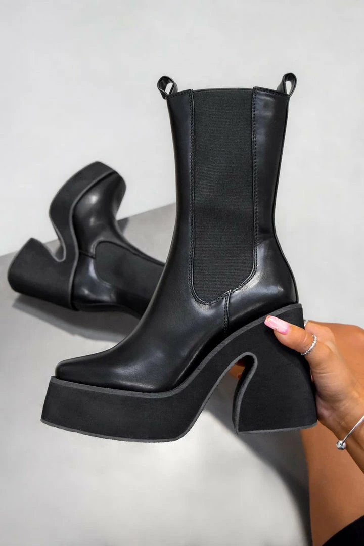 Our Rise boots featuring a platform sole, squared toe, sock fit, inside leg zip and faux PU material.Â