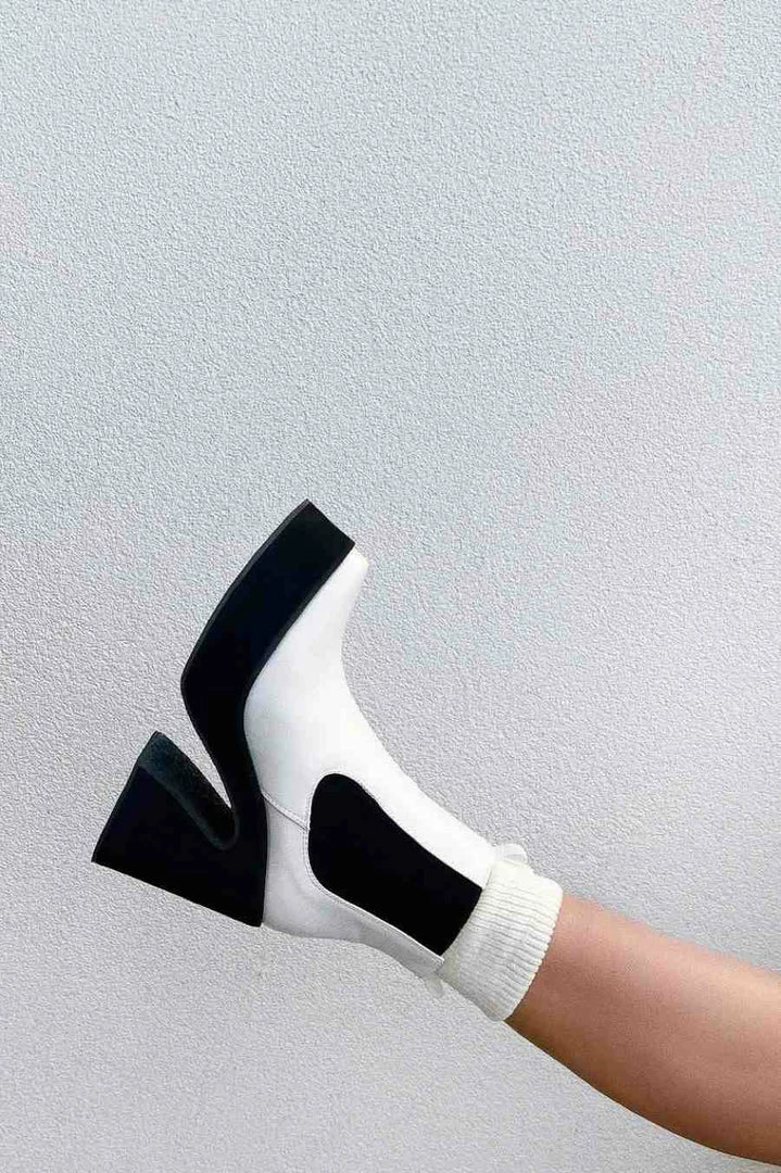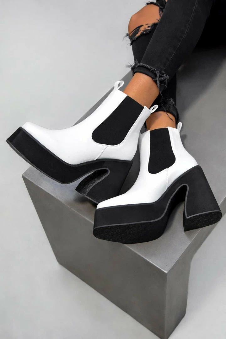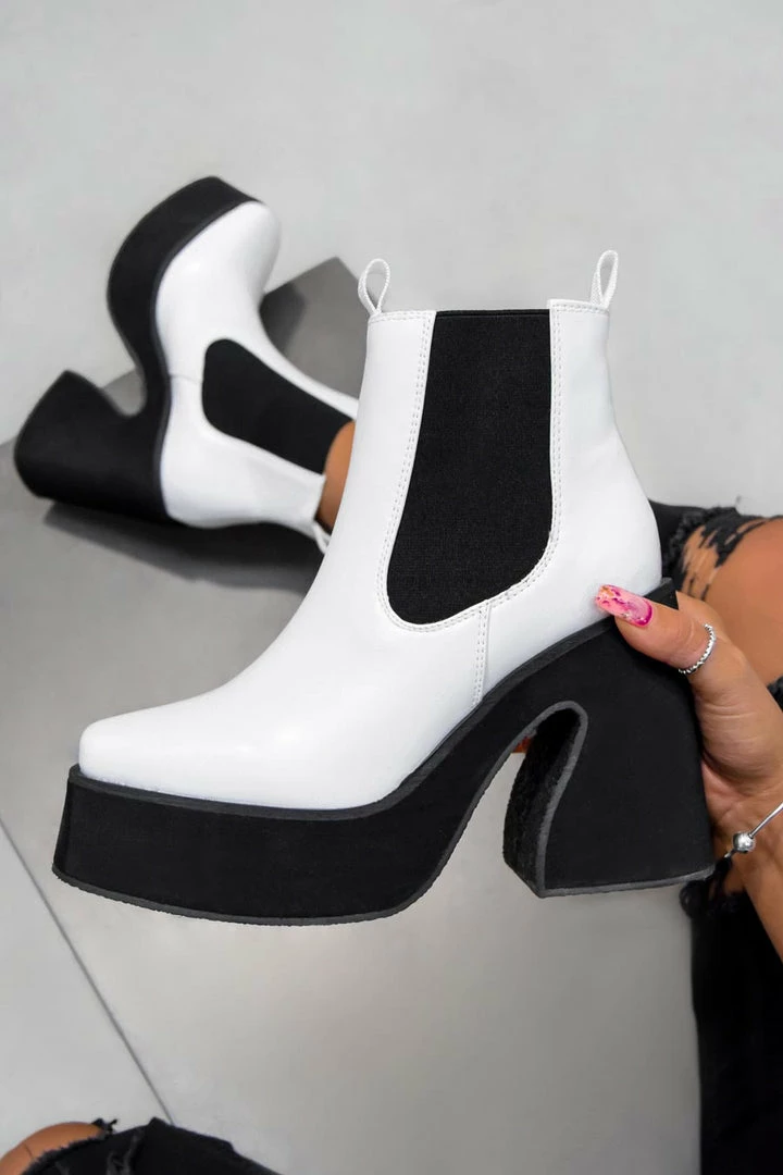 Our Rise Up boots, featuring a platform sole, squared toe, slip on with elasticated side panels in a faux leather material.Â