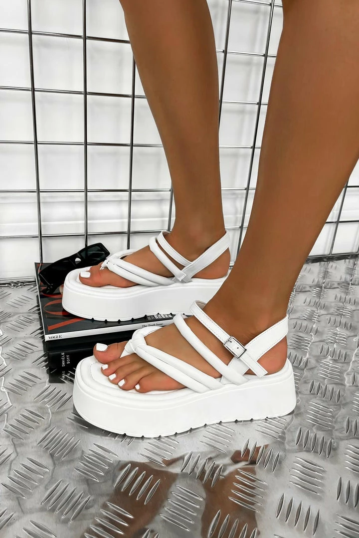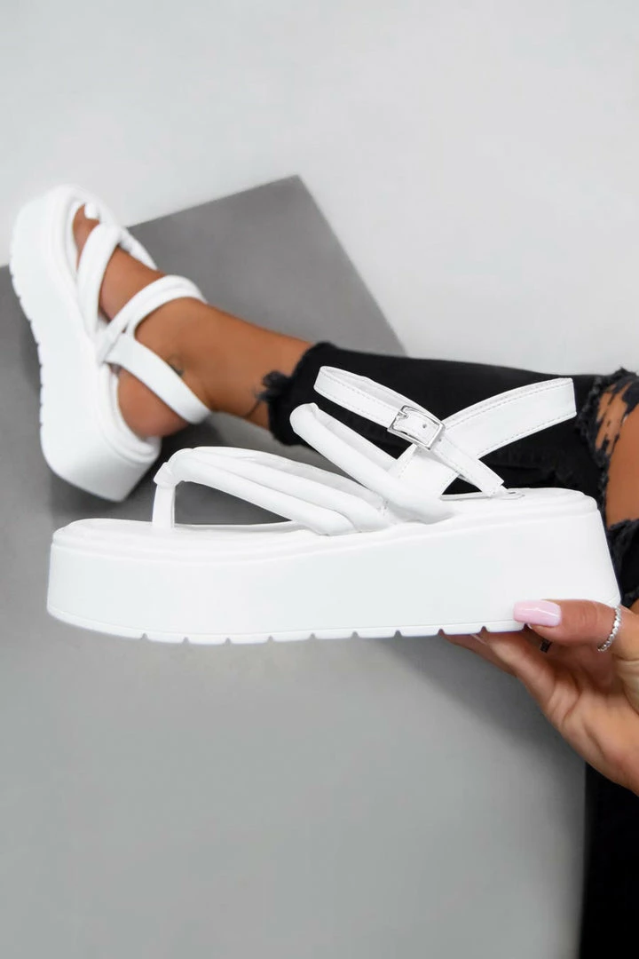 Our Steffi sandalsĀ featureĀ a chunky sole with a toe post, strappy front design, fastening with a silver buckle around the ankle and a super comfy padded sole