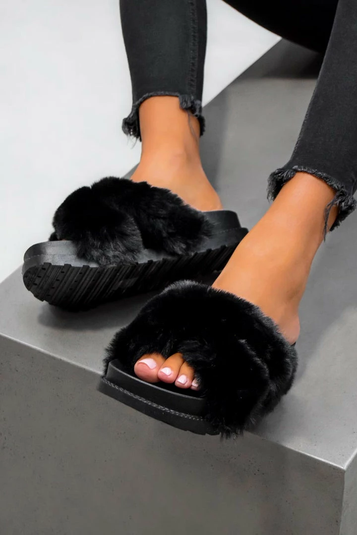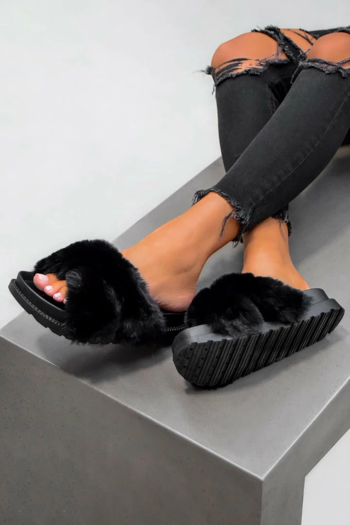 Our Adella sandals feature a chunky cleated sole design with cross over faux fur front.