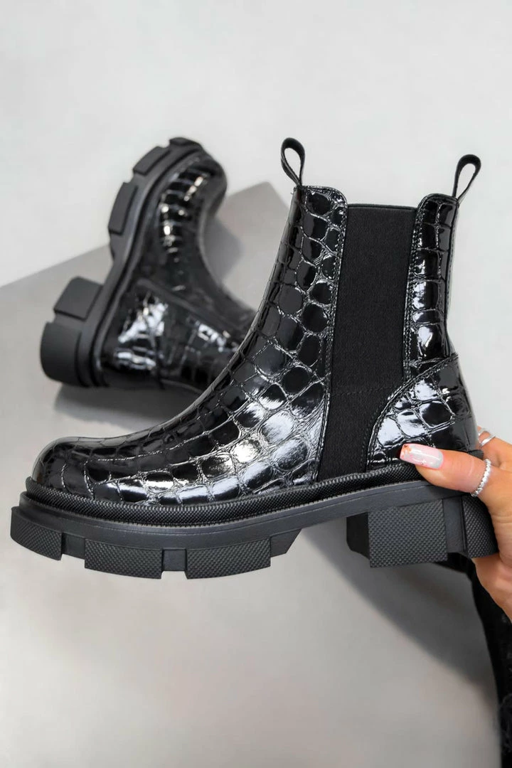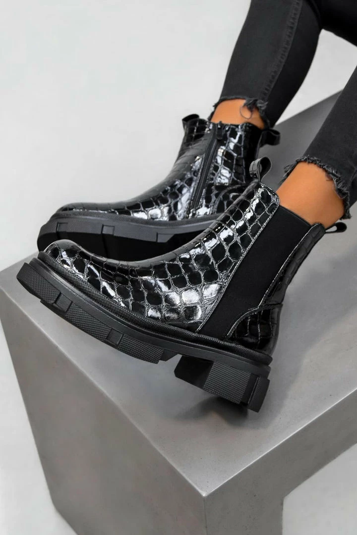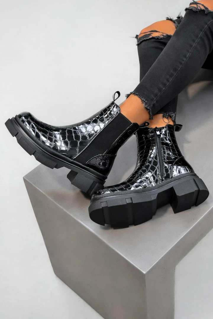 Our Camila boots feature a inside zip with elasticated side, chunky sole & croc patent finish.