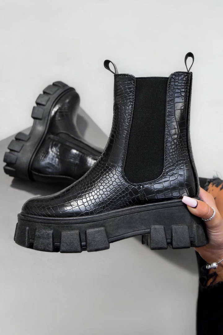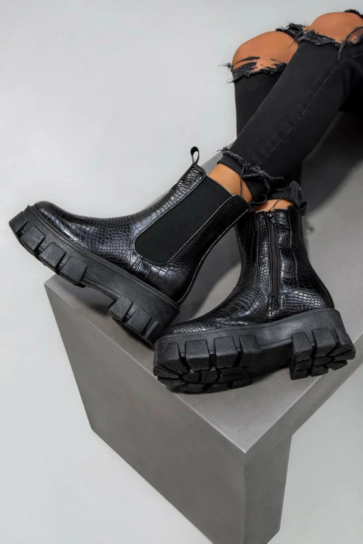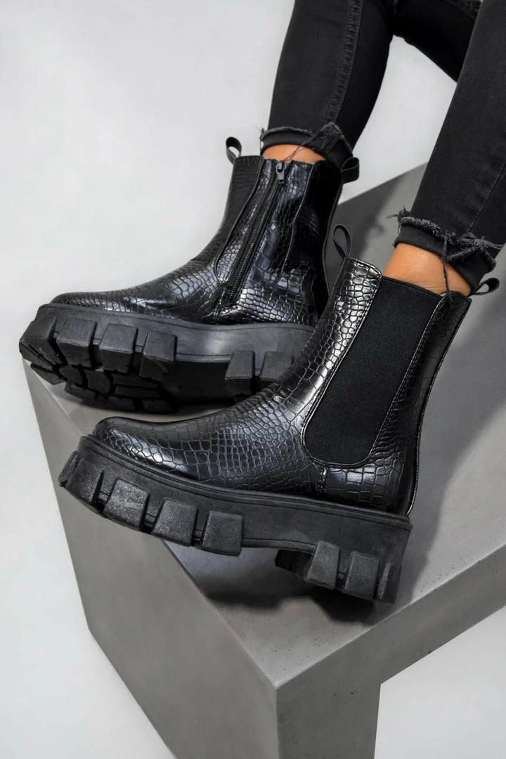 Our Elevate boots feature a super chunky platform sole, inside zip in a croc finish.