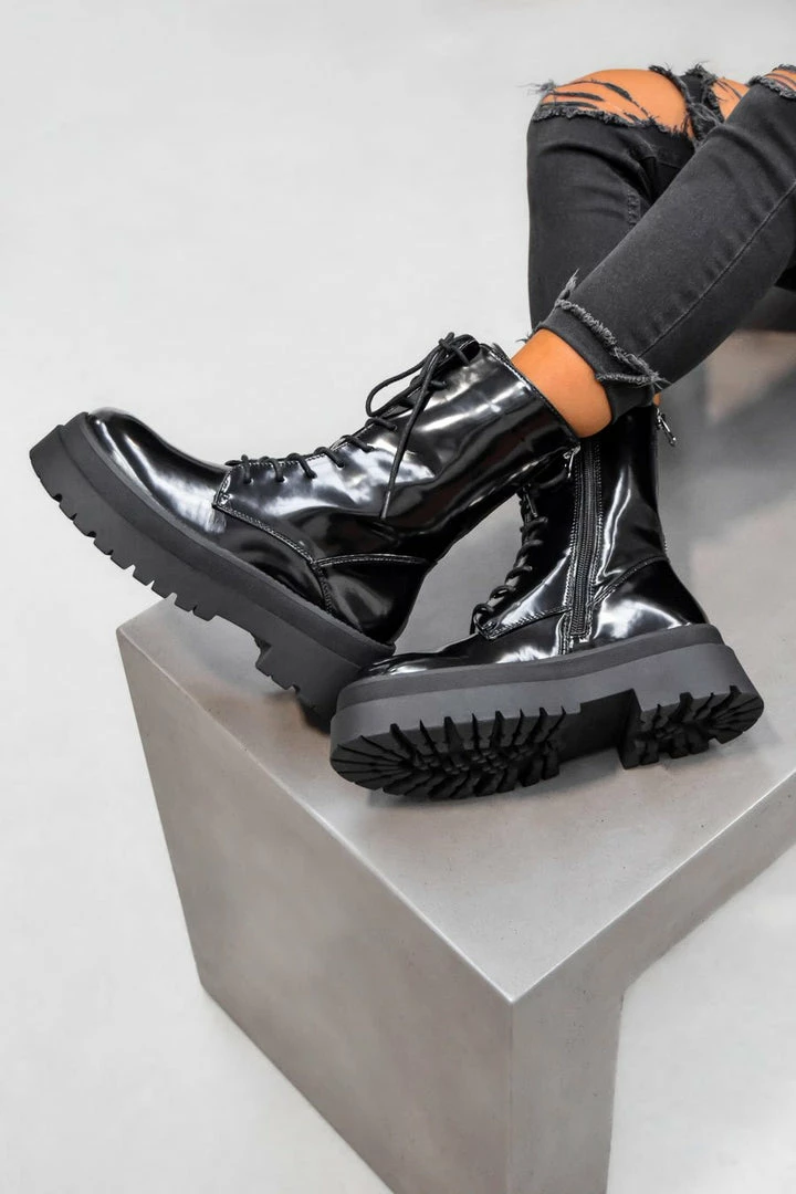 Our Fierce boots feature a lace up front, a silver decorativeĀ zip up theĀ back and a functional insideĀ zip, chunky sole and a matt patent finish.