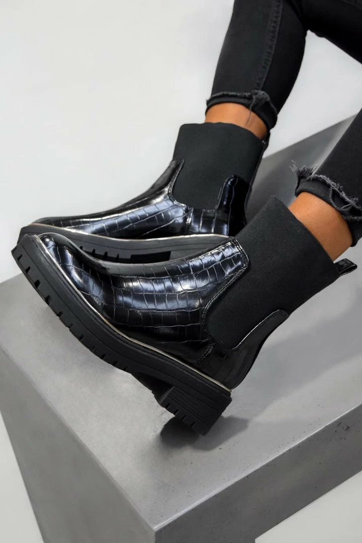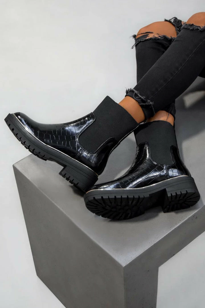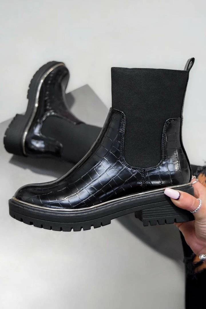 Our Jessy boots Featuring a pull on design with elasticated side panels and ankle opening, chunky sole with a gold trim.
