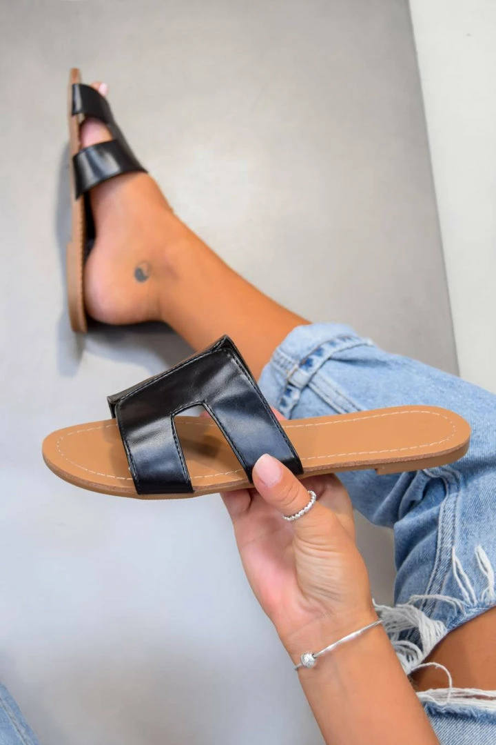 A definite Summer essential for this season, our Kait slip on sliders will be your go to slider. Featuring a loop cut out design and faux leather PU material, pair with some ripped jeans to complete this look.Â