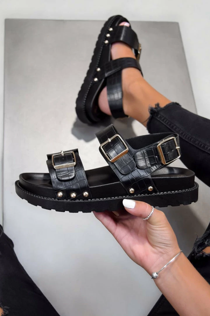 We’re obsessing over these new sandals for S/S21. Our Kiko sandals feature a multi croc print strap design with gold buckle and studded detail.Â