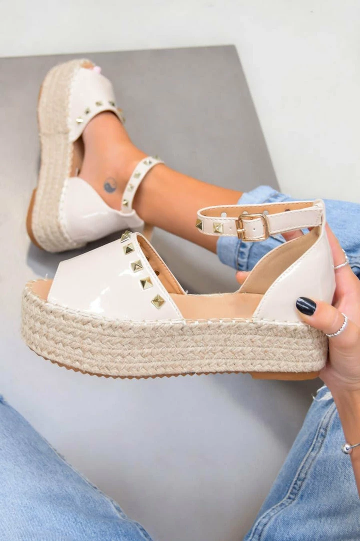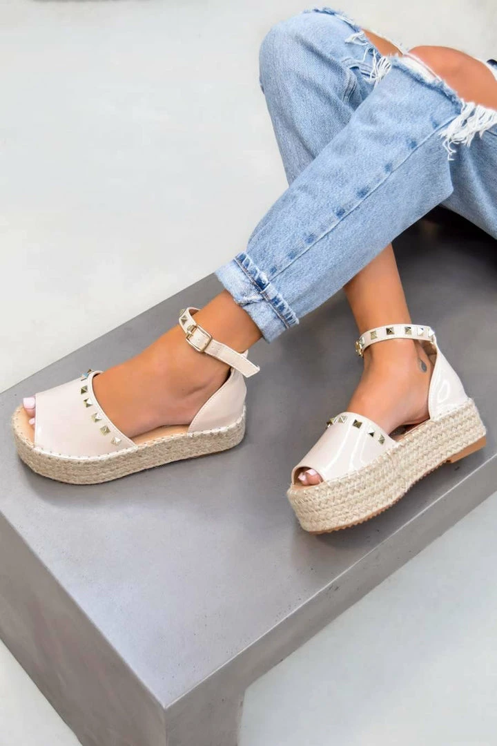 Our Kina sandals are essential for the Summer season, featuring a chunky raised flatform design with espadrille trim, gold studded detailing and nude patent finish.