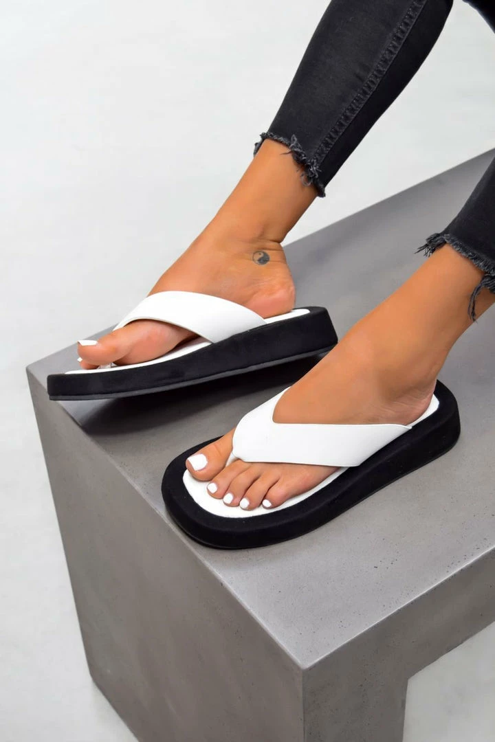 Our Nieve sandals featuring a chunky flat-form sole and toe post design.