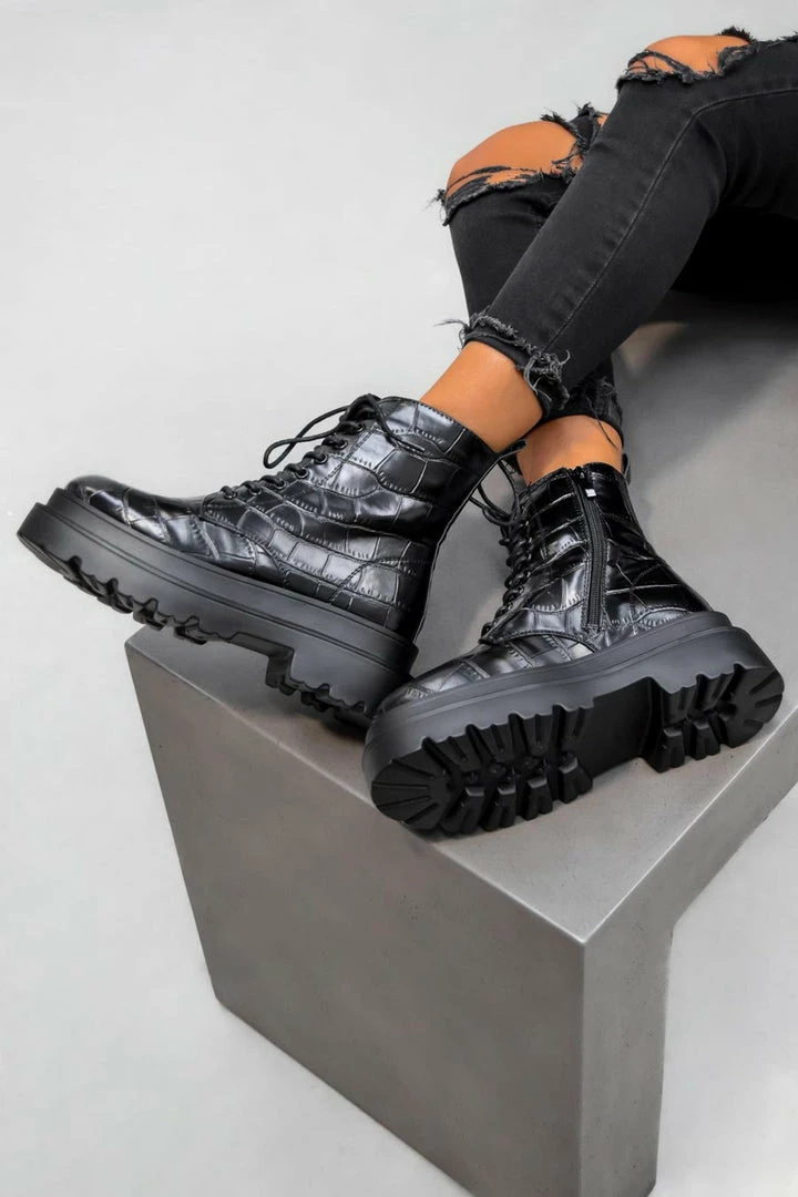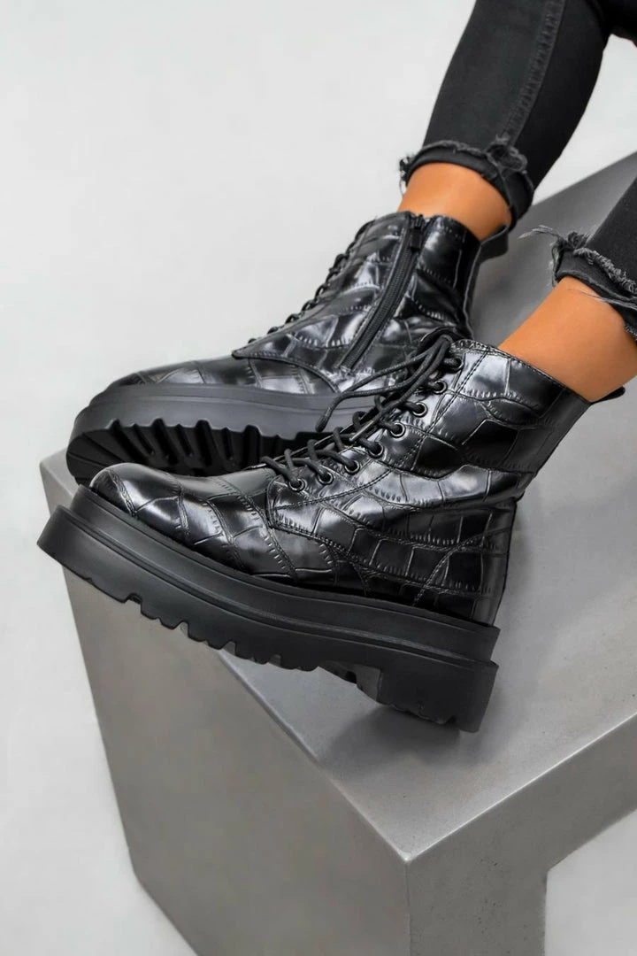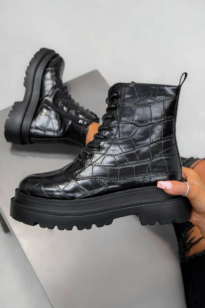 Our Regulate boots feature a lace up front, chunky sole & croc PU finish.