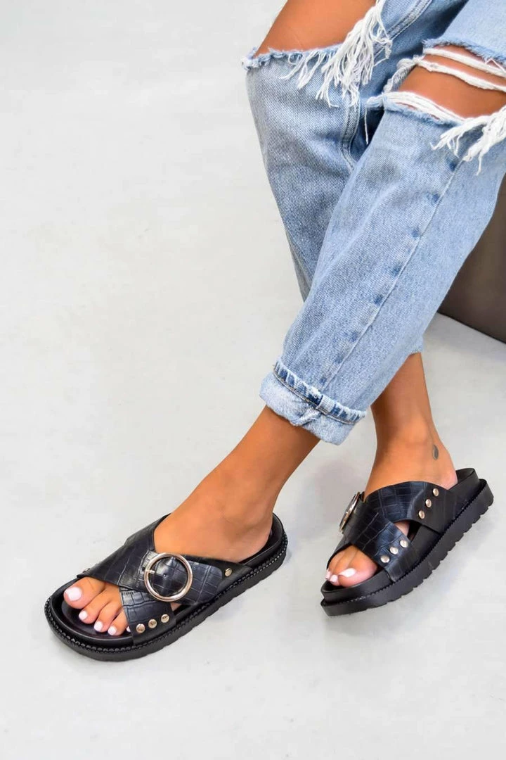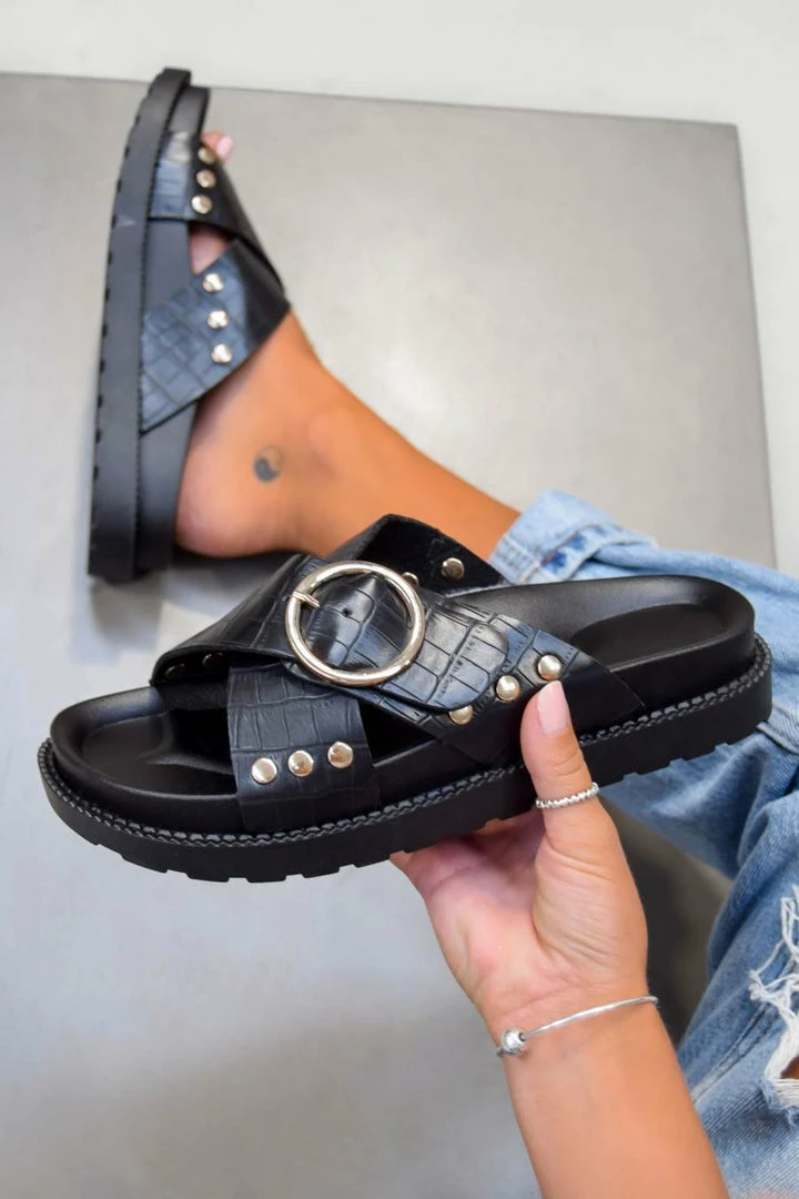 A definite Summer essential for this season, our San An slip on sandals will be your go to pair. Featuring a crossover strap design finished in a croc print material, studded trim and gold ring detail, pair with some ripped blue jeans to complete this look.Â