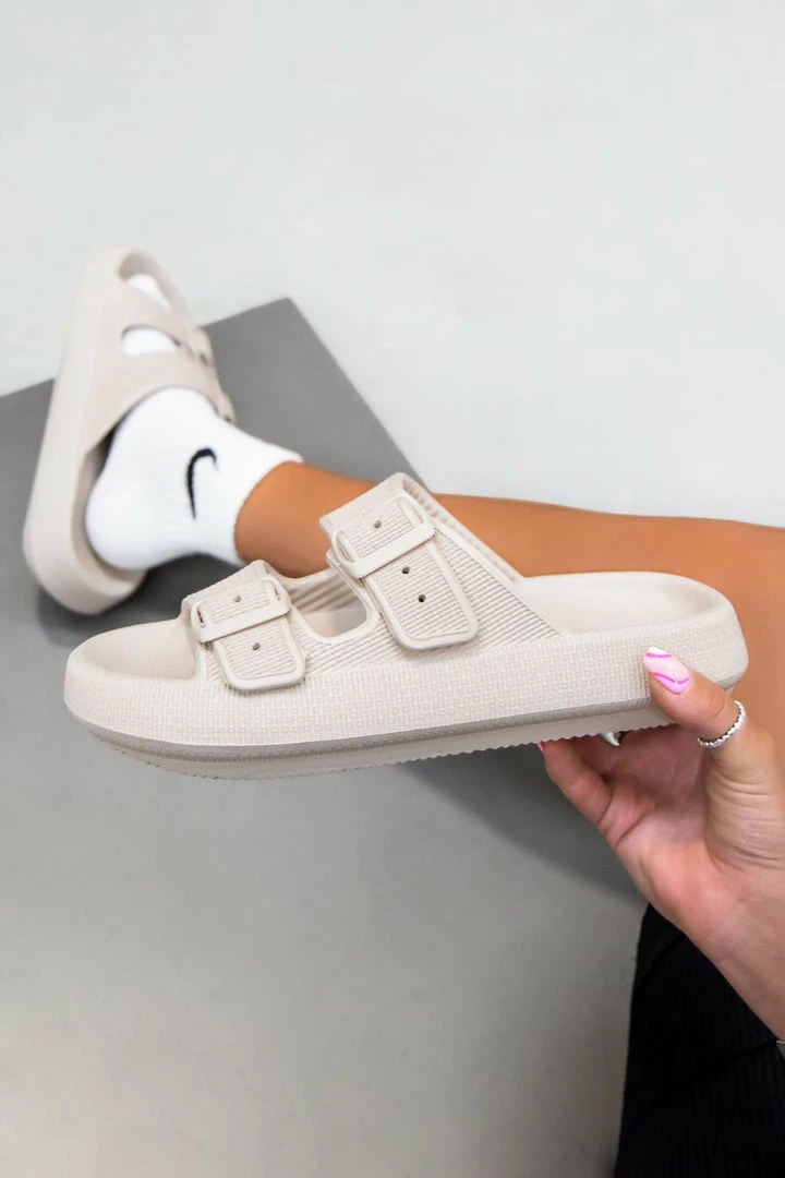 Our Mable sandals featuring a beige rubber textured material, double front strap with buckles and a comfy flat design.
