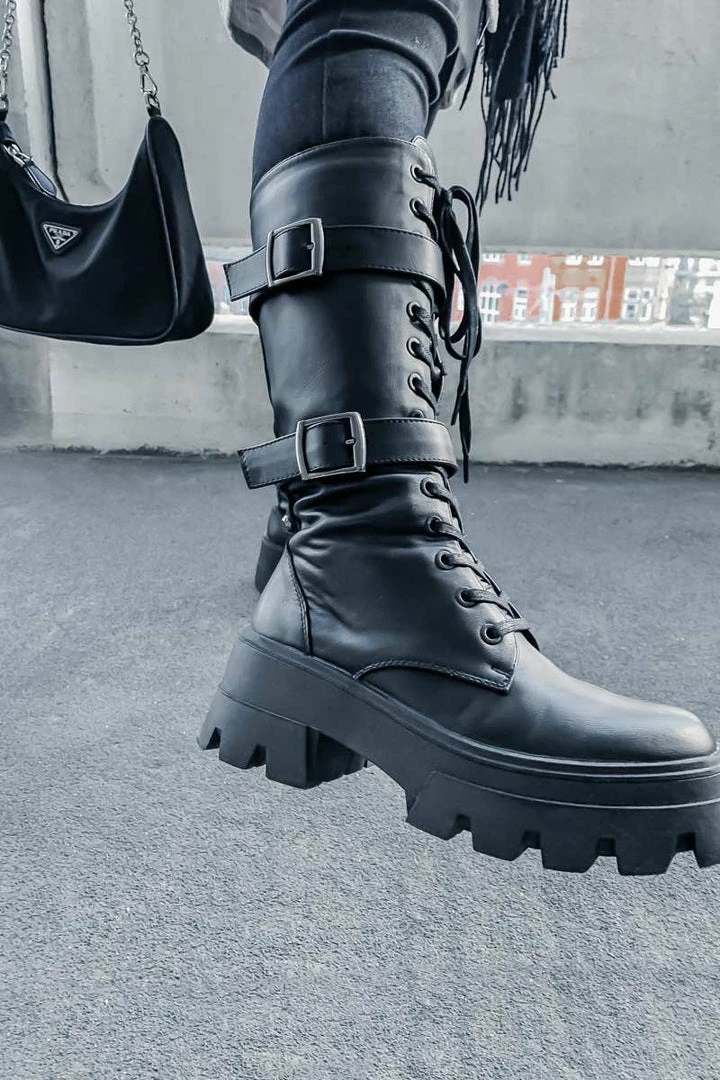 Our Mayhem boots feature a lace up front with an inside zip, buckle detail, chunky sole with a PU finish
