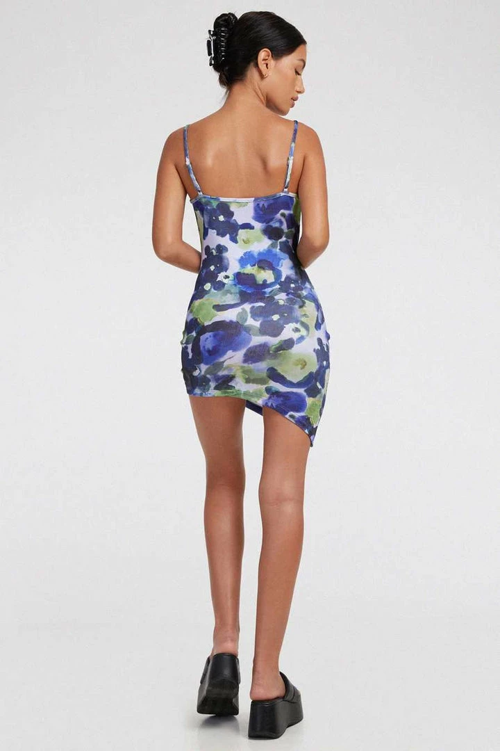The Motel Batia dress features a blue abstract water colour fabric, a cowl neckline, thin straps and a bodycon design
