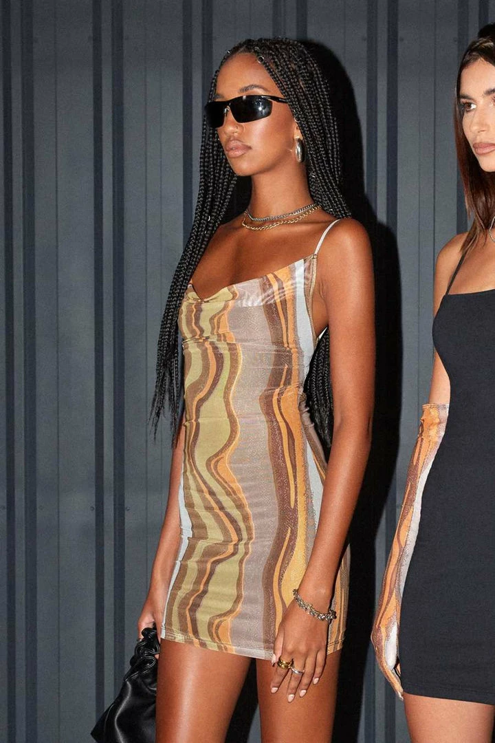 The motel Rocks features a bodycon mini fit with thin straps in an earthy gradient print.